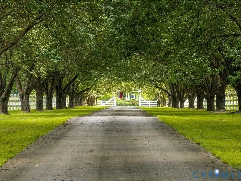 - Tree-lined driveway with horse pastures
