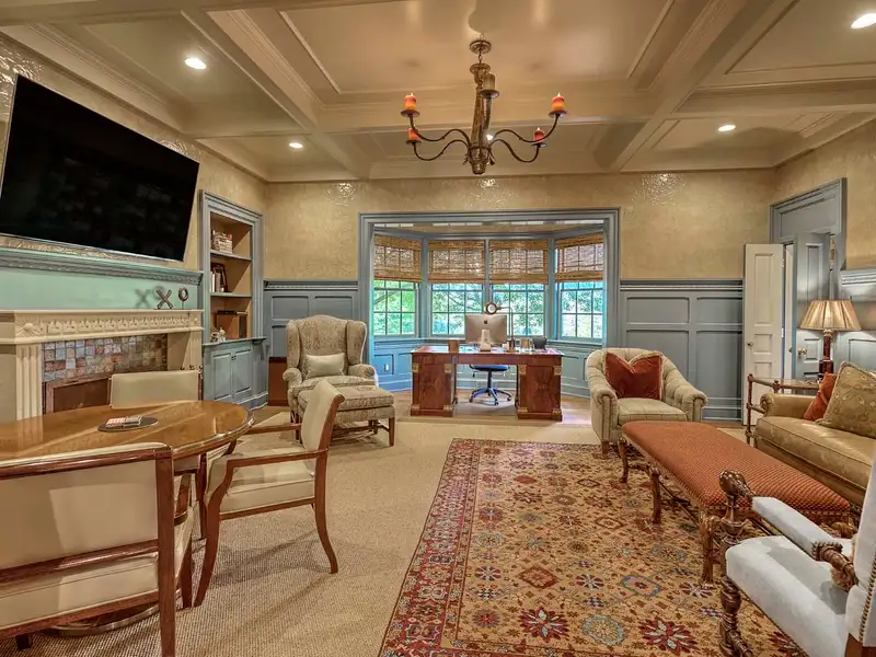 Classic design elements within the layout include seven intricately mantled fireplaces, oak wood floors, arched doorways, traditional moldings and woodwork, stunning architectural details, unique built-ins, custom-painted rooms, exposed ceiling beams, two wet bars, a rear staircase and covered porte-cochère access to the home's three-car garage. Hiland Hall Turner Architects oriented the residence on the acreage to take advantage of morning sunlight in the front rooms and colorful sunsets in rear-facing spaces.