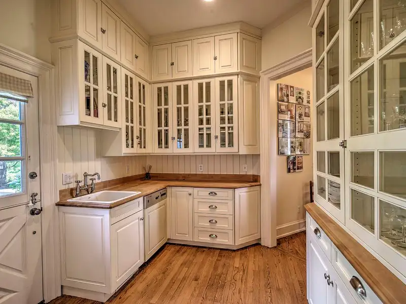 The epicurean kitchen presents a center island with a prep sink, Franke farmhouse sink, custom cabinetry and a sun-splashed dining area with a domed ceiling featuring a hand-painted cloud mural. A collection of high-end appliances includes a Viking range, Sub-Zero refrigerator, Bosch dishwasher and wine refrigerator. Adjacent to the kitchen is a secondary office space and a butler's pantry. The floor plan continues into a great room set under towering vaulted ceilings accented by reclaimed wood beams. Natural light spills into this space from fixed upper windows and French doors to the porch, while a floor-to-ceiling stone fireplace is a handsome focal point. This part of the home is completed by a mudroom with storage options, informal powder room, staircase to the finished lower level, secondary stairs to the bedroom level, and access to the porte-cochère and garage.