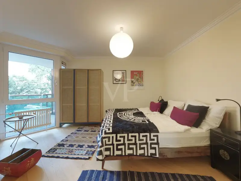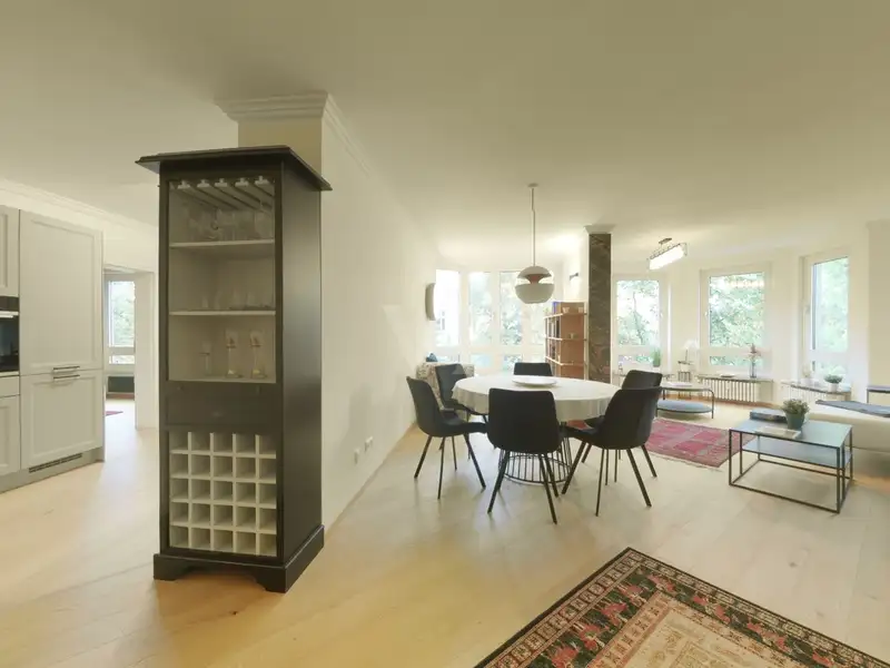 The apartment is located in a well-kept apartment building and can be easily reached via the elevator. Upon entering, you are greeted by an inviting entrance area, which makes a pleasant first impression and offers sufficient space for a checkroom. The generously proportioned living and dining area impresses with bright window fronts that provide plenty of natural light and create a friendly ambience. The highlight and eye-catcher in the living room is a free-standing marble wall. This was designed by the famous architect Mies Ludwig van der Rohe (1886 - 1969) for the World Exhibition in Barcelona in 1929.