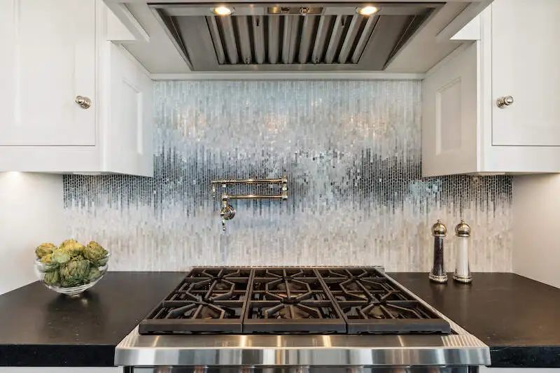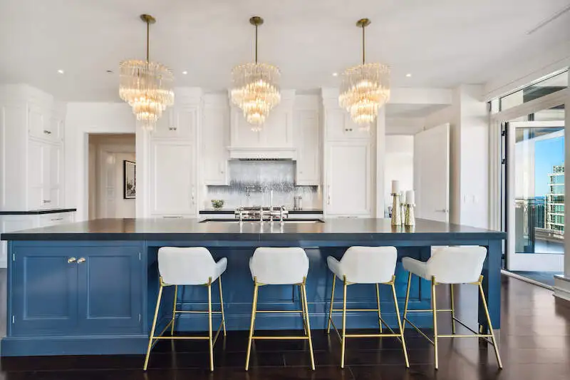 - Kitchen with custom cabinetry and marble counters