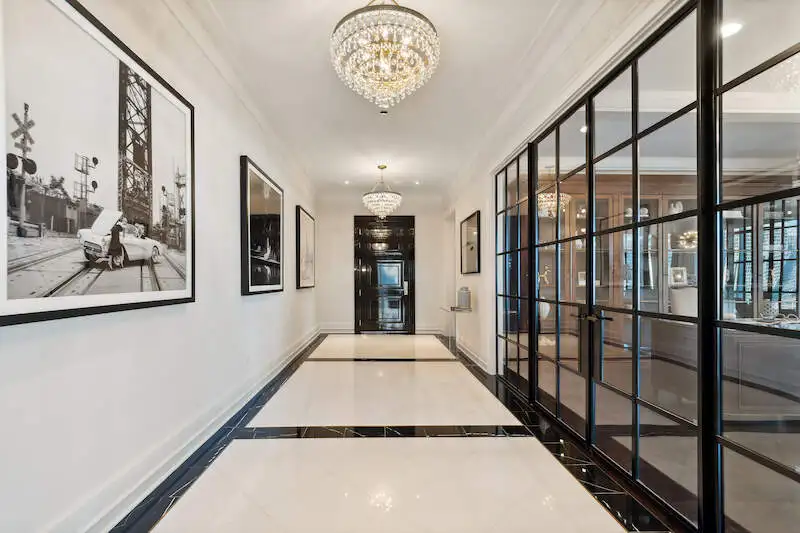- Oversized black lacquer entry door