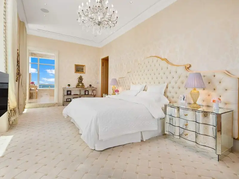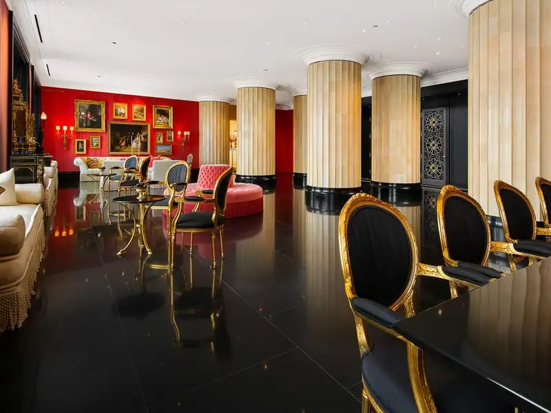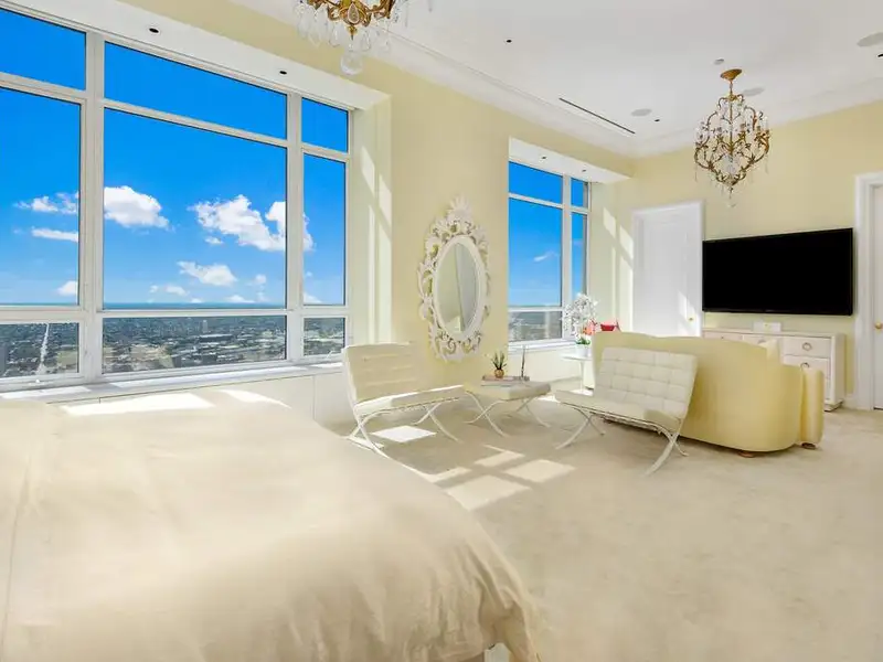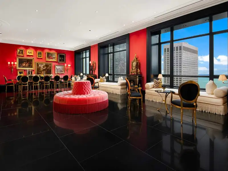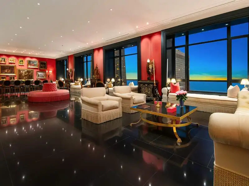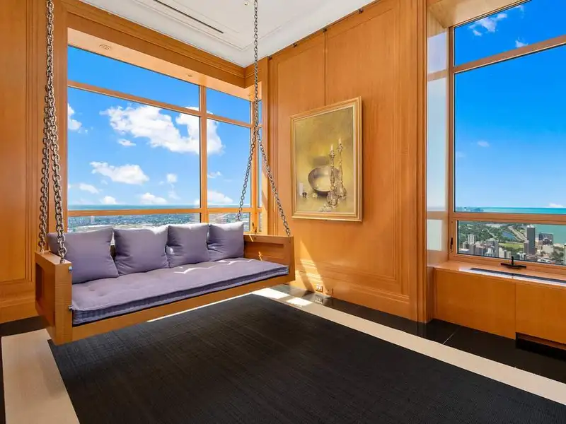 An oasis above the clouds, this one-of-a-kind penthouse comprises the entire 64th floor at the prestigious Park Tower on North Michigan Avenue. Spanning 8,500 SQFT, this 15-room apartment was meticulously crafted by the renowned architectural firm Marvin Herman & Associates and Interior Designer, Mitchell Turnbough. With a 360-degree view of the city, this unique residence is designed to provide an unobstructed panorama of Chicago's skyline. Access this penthouse via one of three elevators and a private elevator foyer, secured with custom designed filigree metal doors and state-of-the-art controls. Herman and Turnbough created a bold sense of exhilaration and drama as you step into the home. The entrance introduces the apartment's 12' ceiling grandeur with an allee of elegant, fluted columns wrapped in cream shagreen. Each space within the home has been purposefully designed to create a sense of majesty without traditional barriers, offering a fluid, uninterrupted walk around the apartment. The living spaces are open and conducive to modern family living, featuring high-level, durable finishes, and bespoke anegre wood paneling. The custom plaster cornice and walls were crafted by hand. Inspired by a vivid Ferragamo scarf, Turnbough enveloped the 2,400 SQFT grand living room and dining room walls in salmon-pink velvet. The space is further enriched with polished black granite floors and lacquered baseboards. The choice of red hues throughout the room enhances the natural light, creating a dynamic interplay of colors that shift with the day's arc, adding a sense of luxury and softness. This ensures the space is equally suited for stately celebrations and intimate gatherings, maintaining a sense of warmth and inclusion regardless of the event size. The dream kitchen features sprawling granite counterspace, top-of-the-line appliances, and is clad in impressive quarter cut figured anegre custom cabinets and wall paneling. A butler's pantry, a unique ovular island, and abundant storage complete the space. The kitchen opens to a great room showcasing spectacular lake and city views with north, east, and west exposures. This gracious space accommodates a breakfast room, a large family room, and a playful 8-person "porch swing," at the west corner of the family room, which floats gracefully from the 12 ft ceilings. The corner primary suite occupies the entire south wing and enjoys abundant sun from southeast exposures and views of the lake and the city down Michigan Avenue. Clad in quarter cut figured English sycamore paneling, no expense was spared in the custom closet & dressing room where you will find copious hanging space, a three-way mirror and a center island. The closet also doubles as a panic room. A luxurious ensuite bathroom, accoutered entirely in a soft golden-green onyx with book matched creamy marbling and gilded gold fittings, enjoys southwest corner views & features heated floors, a steam shower & tub with west-facing views. A sizeable home office paneled in quarter cut figured English sycamore flanks one side of the primary suite while a large exercise room flanks the other side and leads to the west wing of the residence, which is dedicated entirely to four ensuite guest rooms. The owner paid special attention to structural integrity and sound insulation, ensuring a reposeful living environment amidst the bustling city. From an aesthetic perspective, even the door hardware was exclusively designed by Marvin Herman for this penthouse, creating a high level of customization. The home is equipped with automated shades, smart Control 4 integrated surround sound & TV system. This residence offers a rare opportunity to own a significant piece of Chicago's architectural innovation, where every detail has been crafted to ensure unparalleled elegance & comfort. Enjoy Renowned Park Hyatt Hotel amenities at your disposal - 24 hour fitness center, indoor pool, spa, in-room dining, and the acclaimed NoMi restaurant