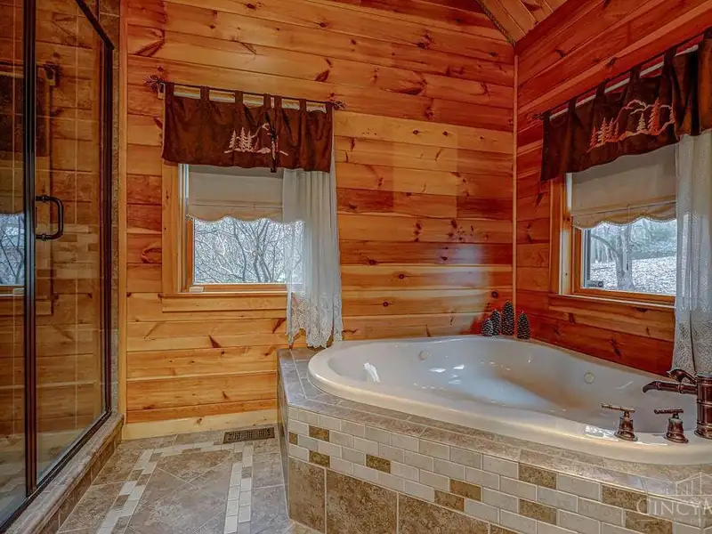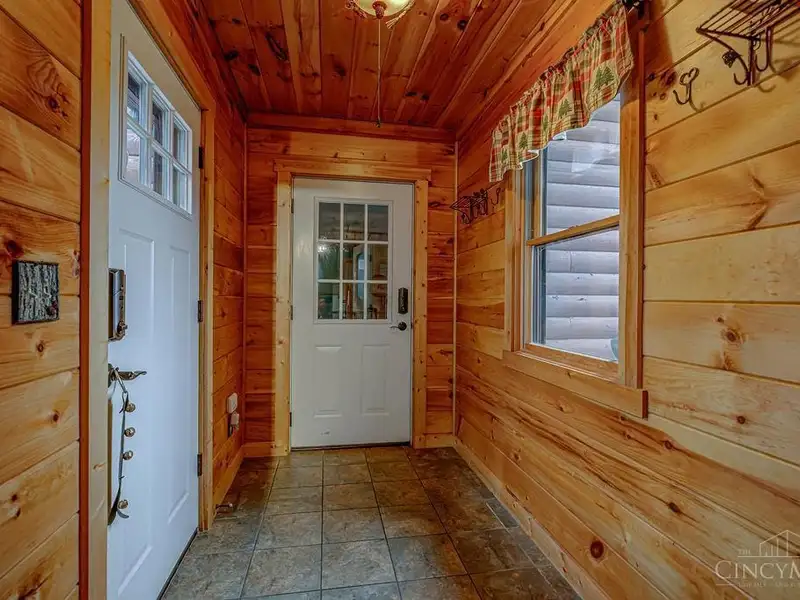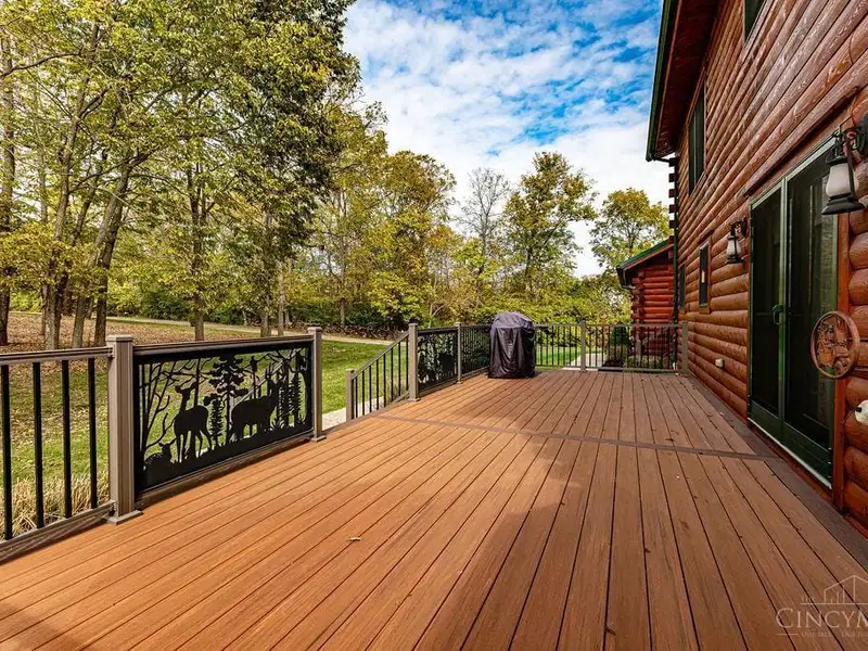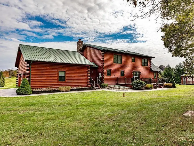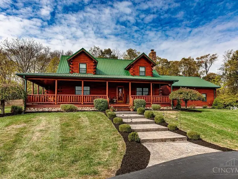 - Gated entrance with custom log home