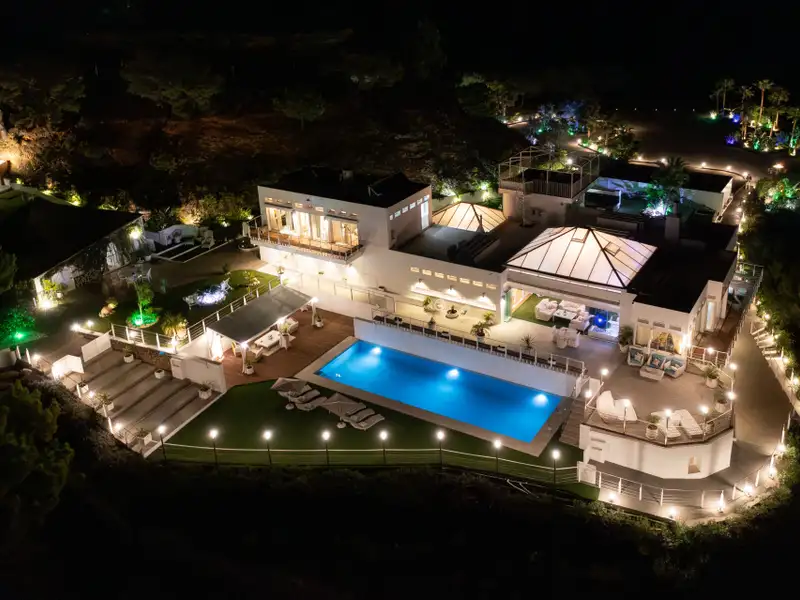 The mansion boasts three main living rooms, each with an exclusive design tailored to different moments of your day. Outside, you will enjoy an unparalleled experience: perfectly maintained Mediterranean gardens, a chill-out corner with a waterfall, barbecue area, tropical pathways, an olive garden, and even a space prepared for a helipad.