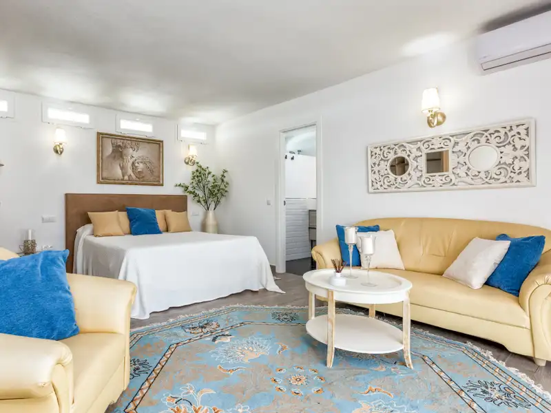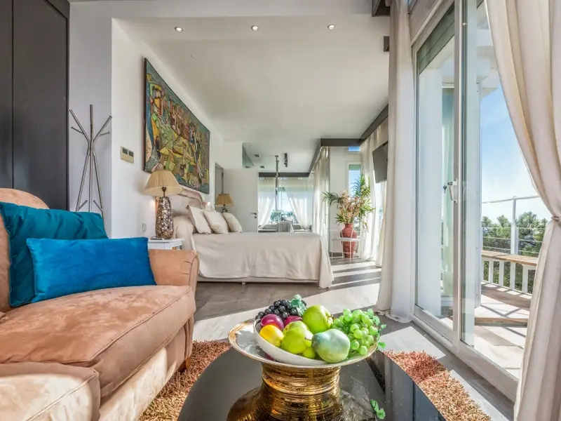 The interiors are perfectly connected with the outdoor spaces. Imagine a living room bathed in natural light, with a winter garden and a transparent dome that creates a unique atmosphere. The kitchen, with an impressive central island and fireplace, offers a functional and cozy space with stunning views of the Mediterranean. The property features two exclusive 45 m² suites and five bright double bedrooms, designed with style and comfort, ideal for family or guests.
