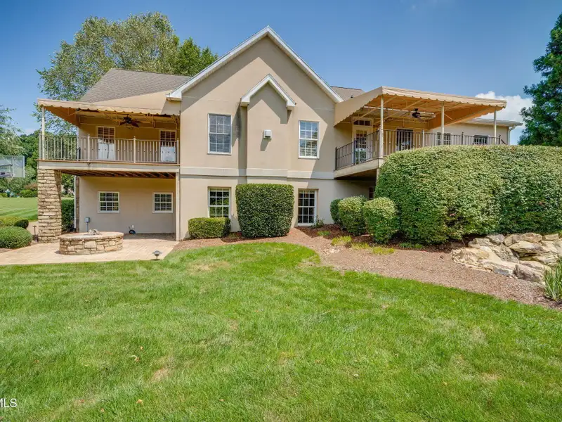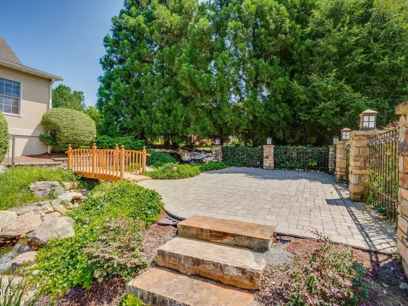 - Multiple patios with waterfalls and pond