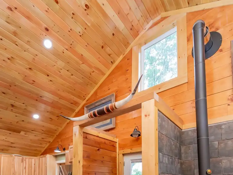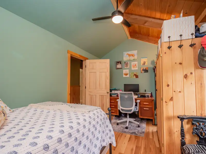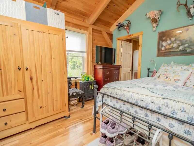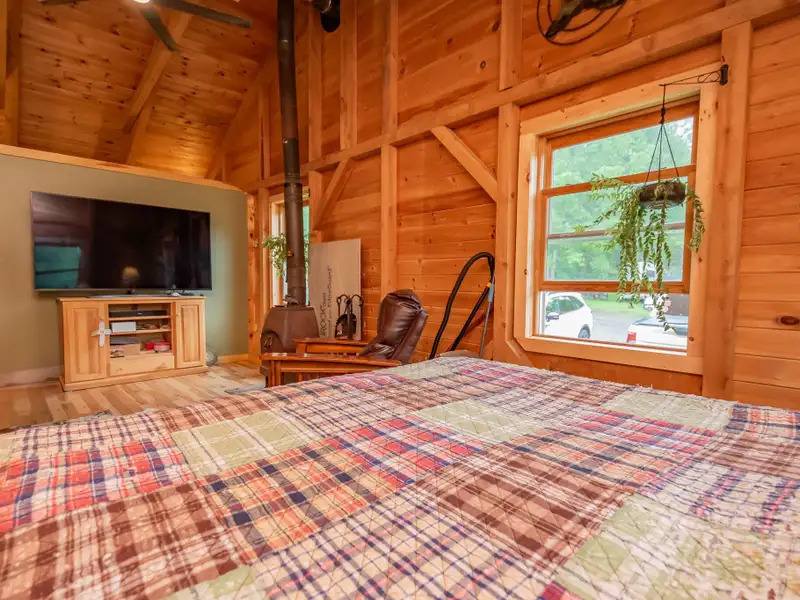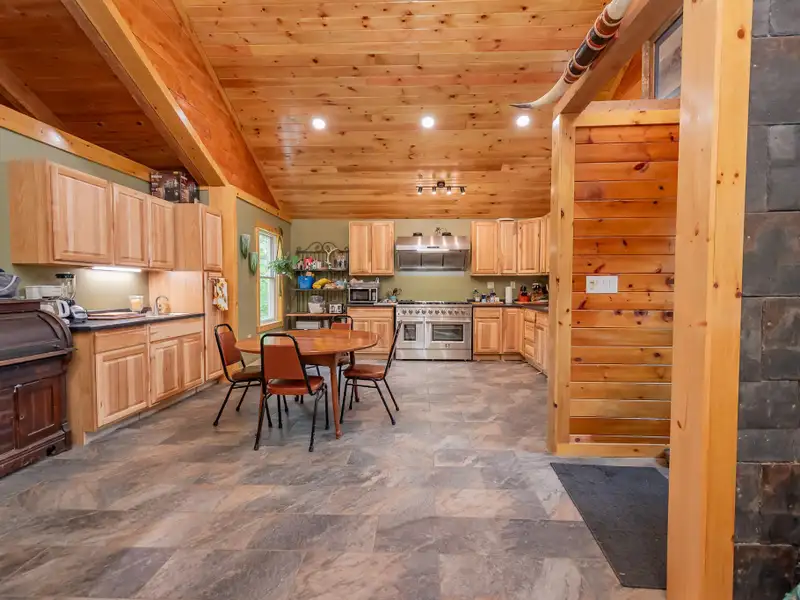 - Vaulted ceilings with exposed beams and hardwood floors