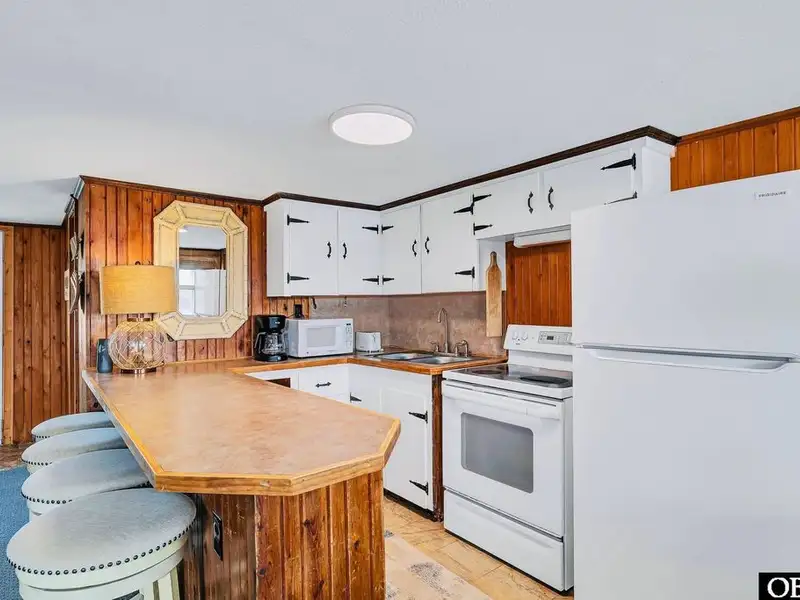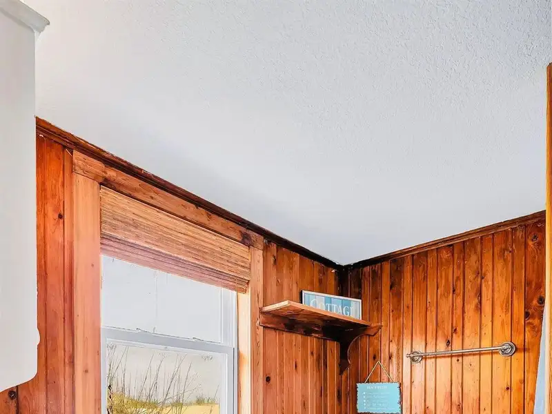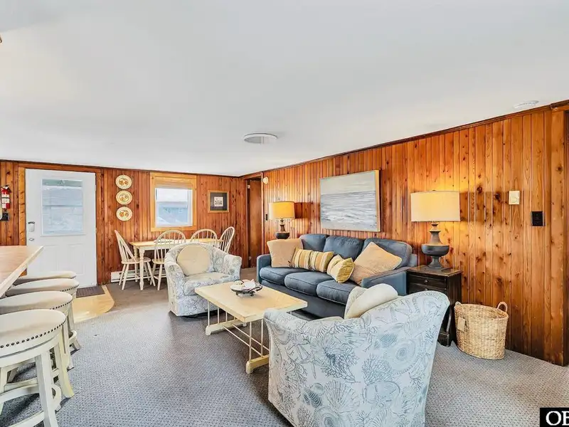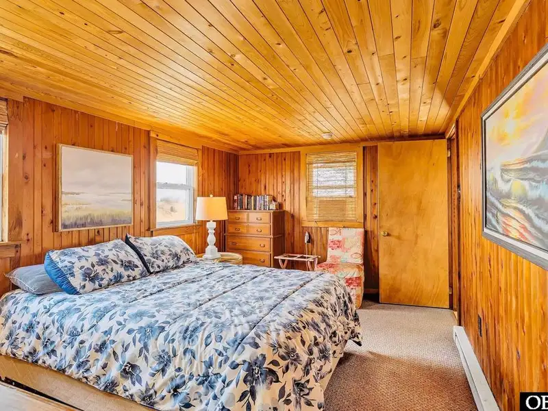 - Open floor plan with cozy wood interior