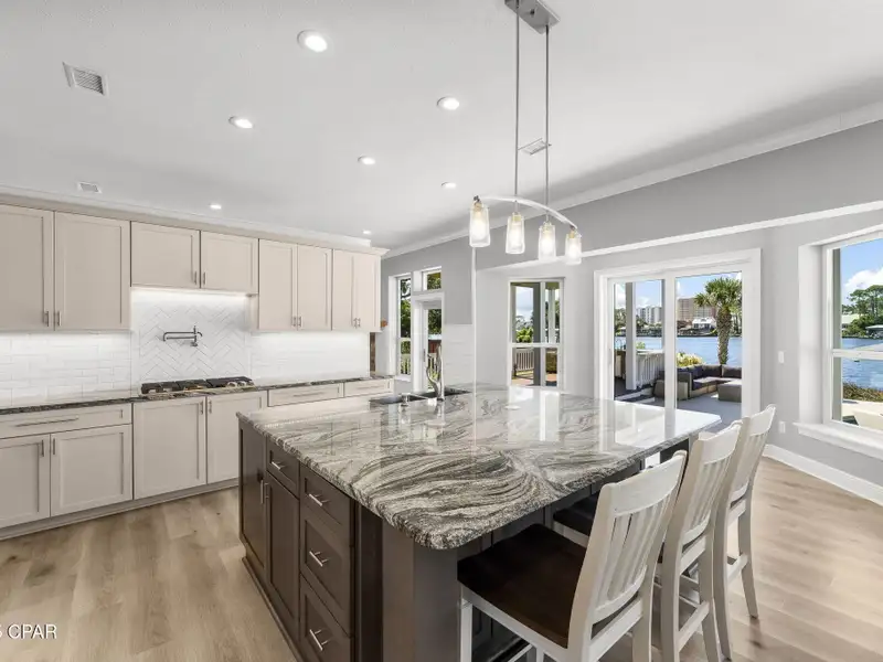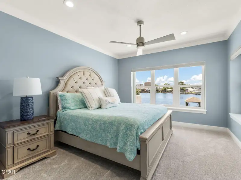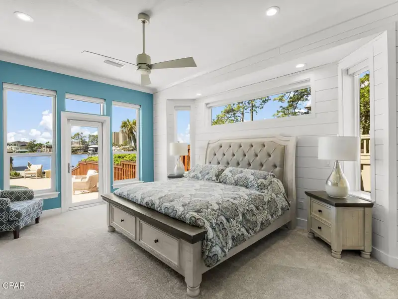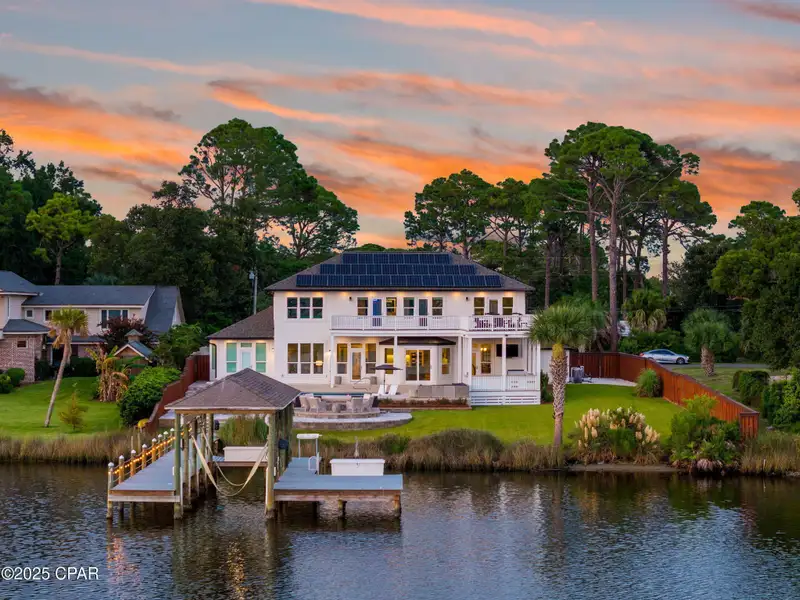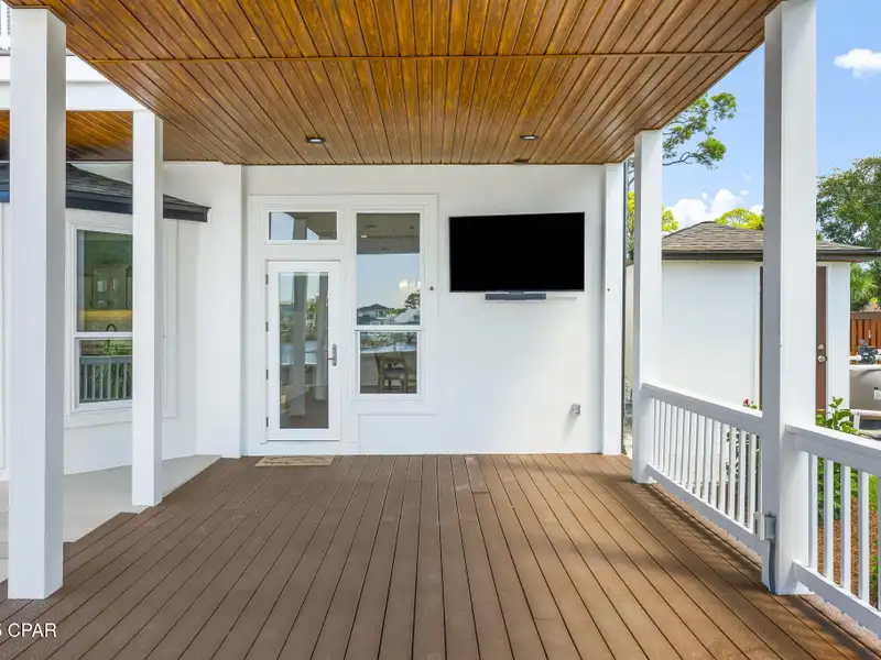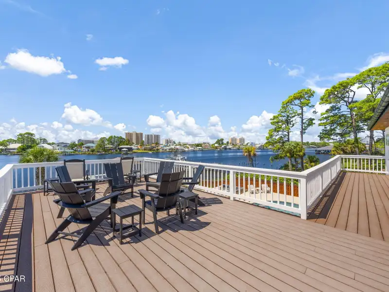 - Covered deck and rear balcony with water views