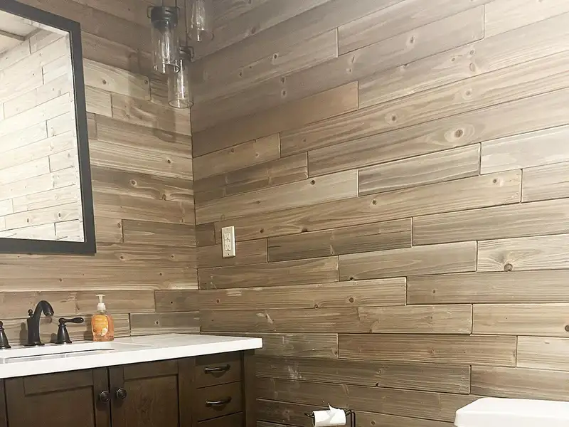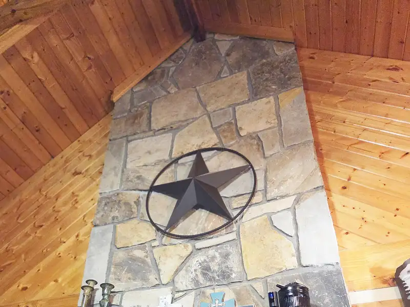 - Floor-to-ceiling stone fireplace