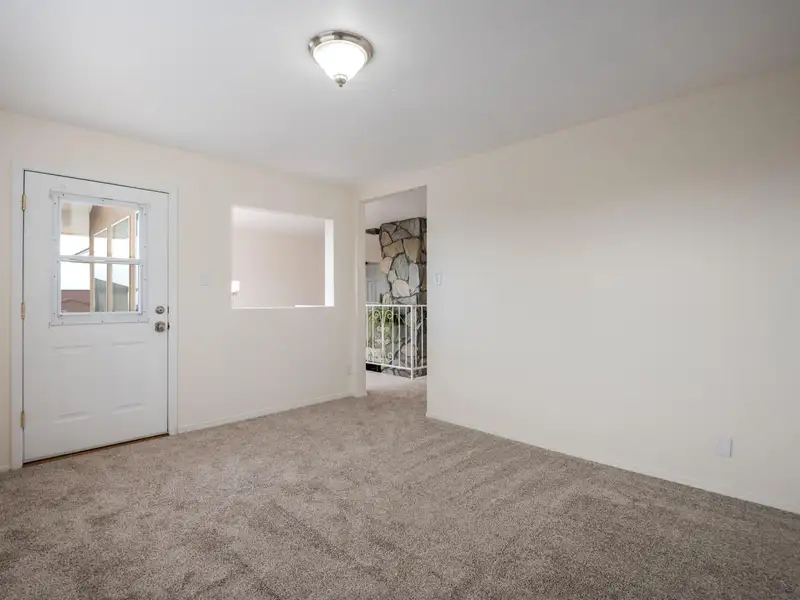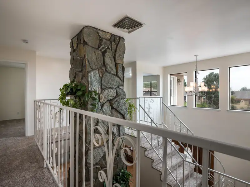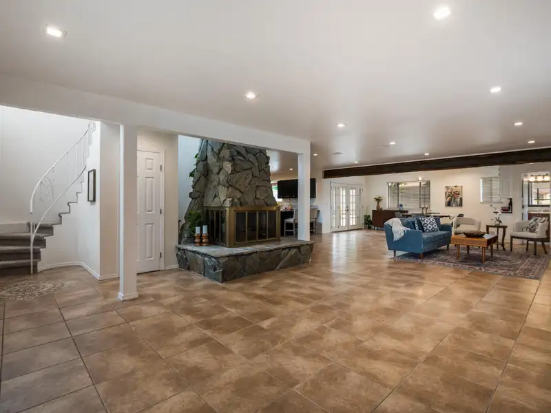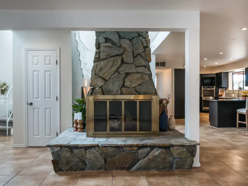 - Stone fireplace in open living area