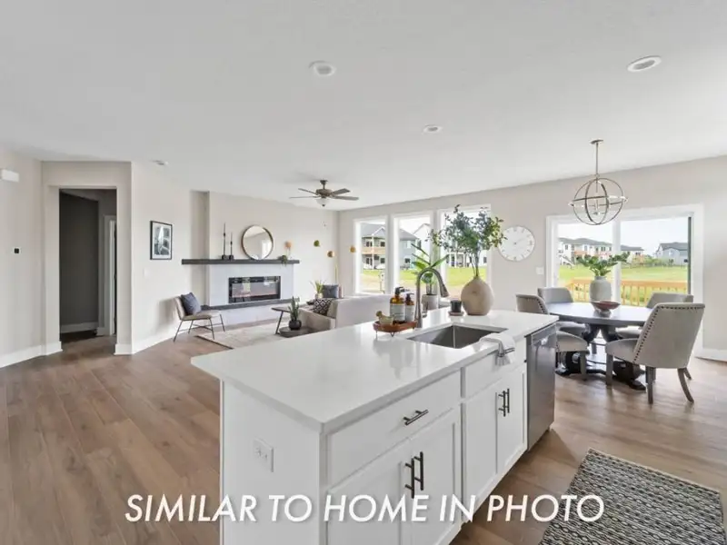 - Kitchen with painted cabinets and quartz island