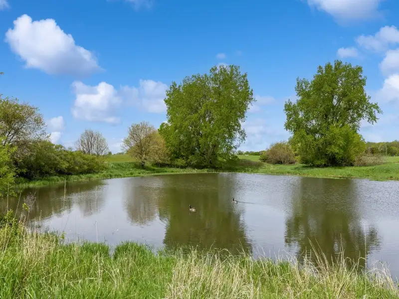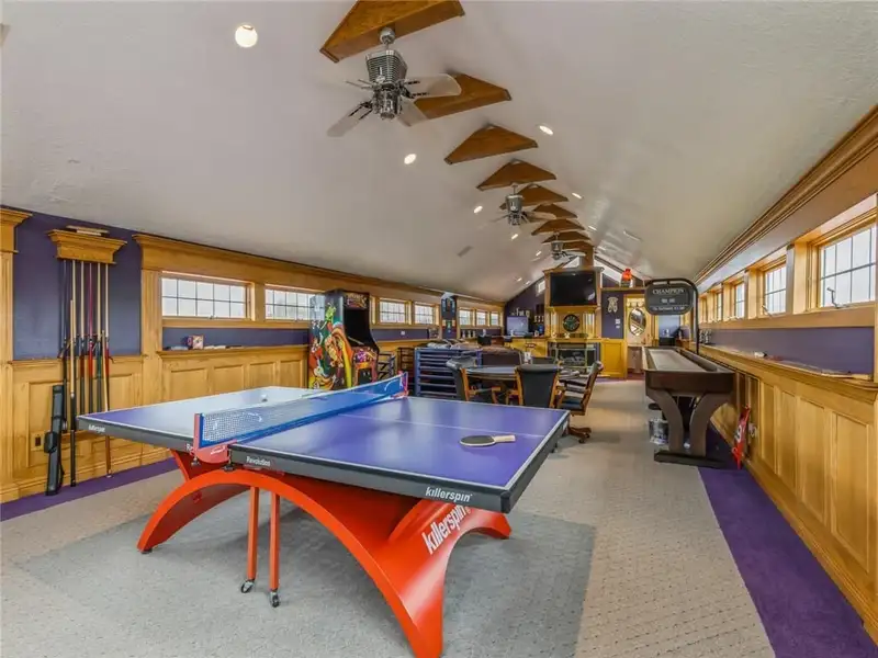 - Rec room with fireplace and pond views