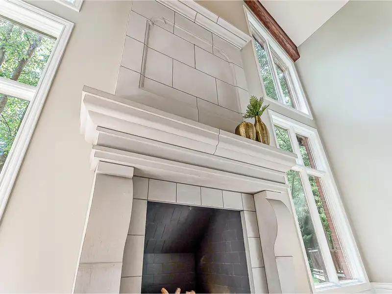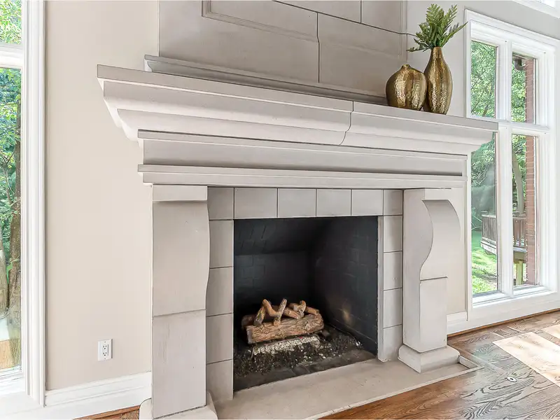 - 14-foot cut limestone fireplace centerpiece