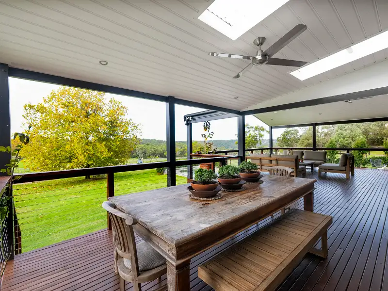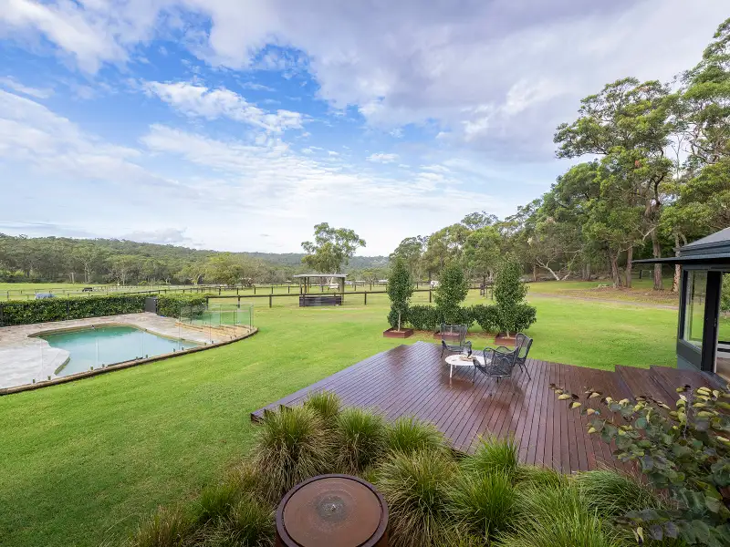 Set on 17.4 arable and flat acres, boasting spectacular views of the entire horse haven, this peaceful and private acreage sits high above Berowra Waters with views across the horizon. This signature farmhouse inspired residence melds seamlessly from the traditional to the modern extension and out to the grounds beyond through large glass openings.