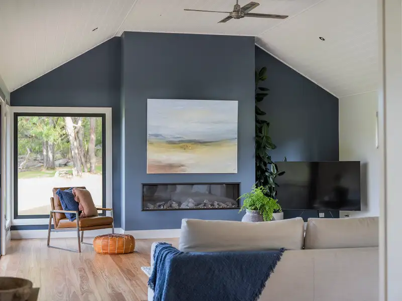 - A modern living area featuring a high set covered ceiling, fireplace, timber floors looking out to the pool area