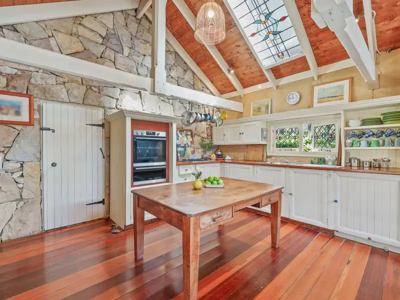 Showcasing artisan sandstone, sculptural features, stain-glass windows and skylights throughout, this family home includes three large bedrooms, each with ensuites and walk-in robes, a light filled art studio and, at its heart, the kitchen and living spaces each adorned with inviting wood fireplaces providing warmth and comfort.