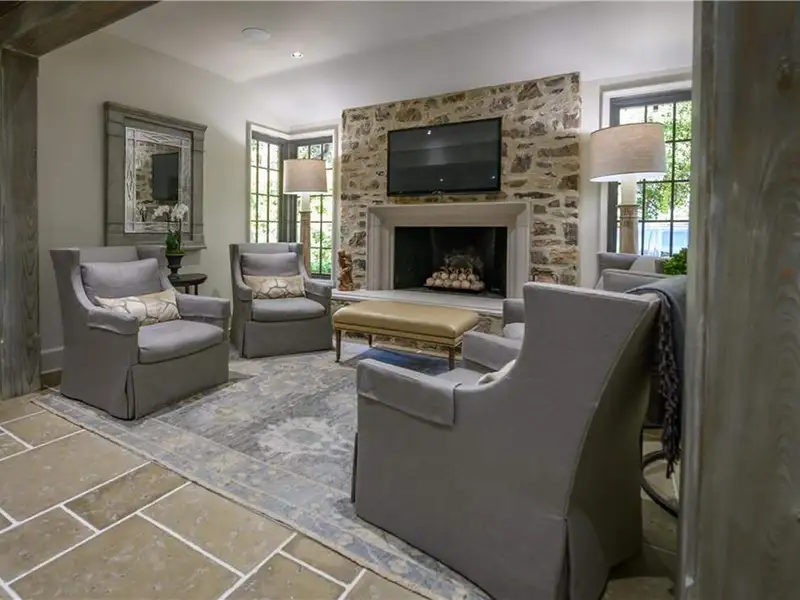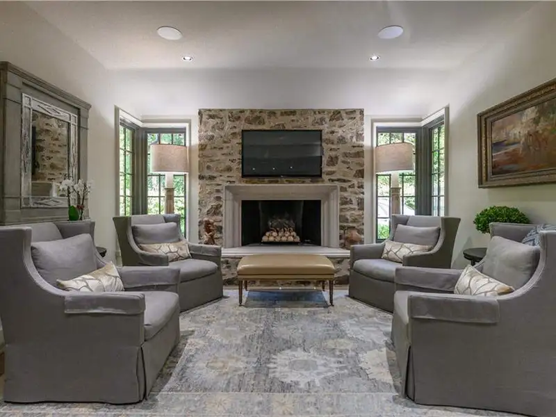 - Oak floors and limestone fireplaces