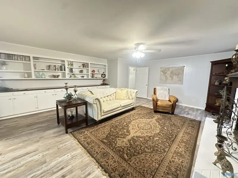 - Den with built-in shelves and brick fireplace