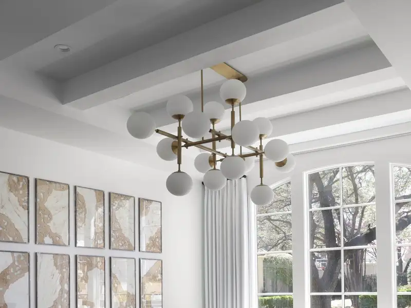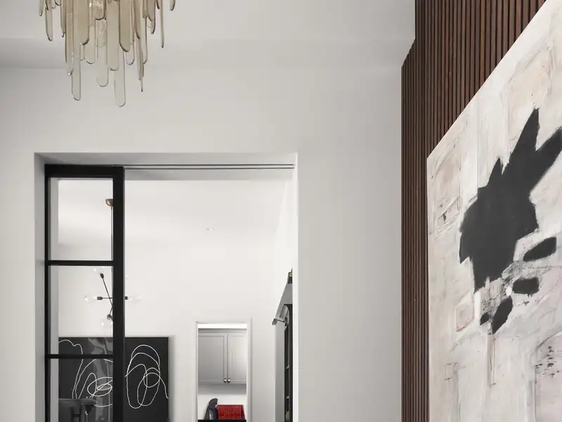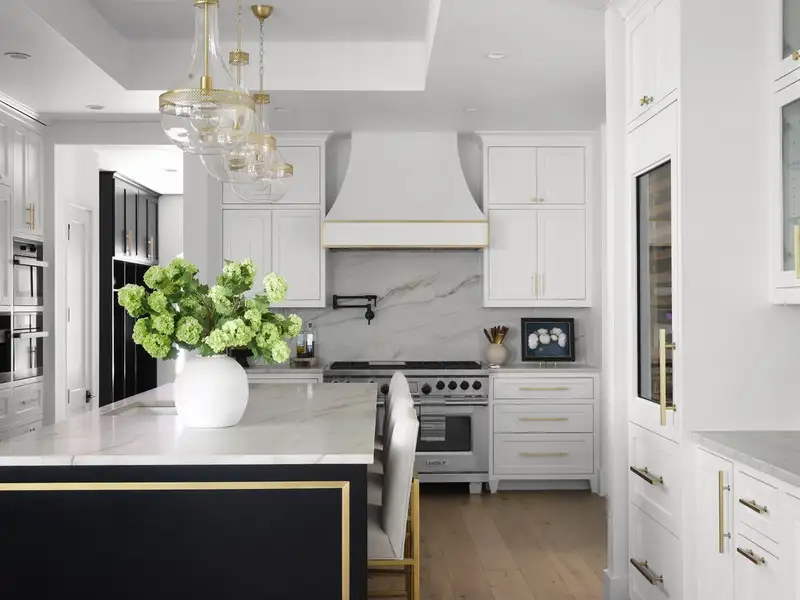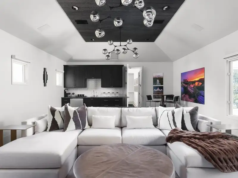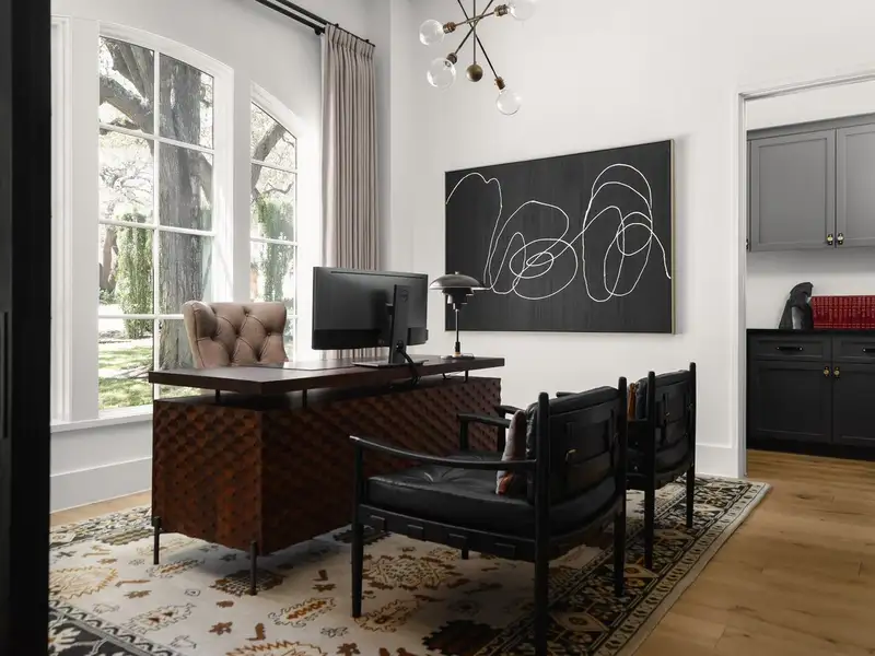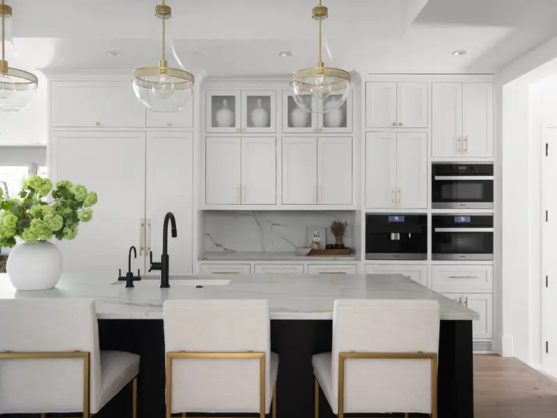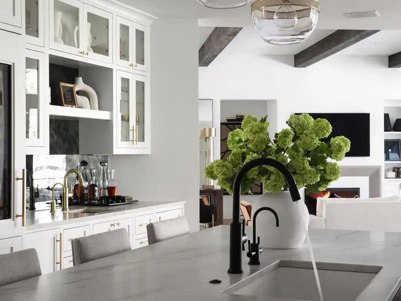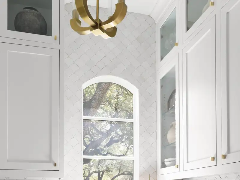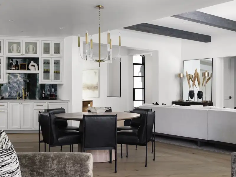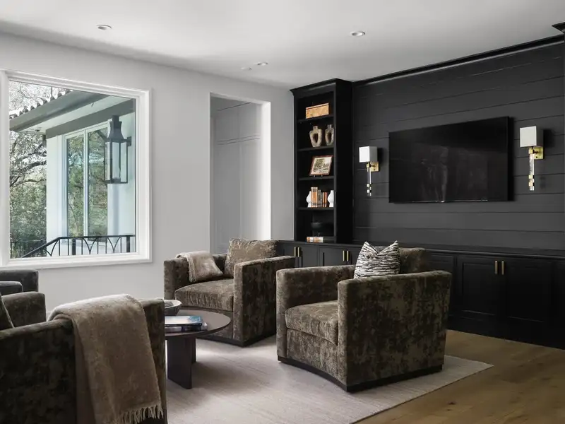 Inside, every detail speaks to a heightened level of design. White oak floors, lueders stone, and tiles from Ann Sacks and Horizon Italian Tile form the foundation of a serene and stylish palette. Designer lighting fixtures complement handcrafted custom cabinetry and countertops curated from Architectural Tile & Stone. The kitchen is outfitted for a culinary connoisseur with Wolf, Sub-Zero, Miele, Cove, and Marvel appliances, while custom hardware and plumbing fixtures elevate the tactile elegance throughout. The living spaces, graced with bespoke millwork from Delta Millworks and striking custom railings, include multiple sitting areas, a formal dining room with adjacent butler’s pantry, a media room with wet bar, and a bright lounge that flows seamlessly through bi-fold doors onto the covered veranda, creating indoor/outdoor living.