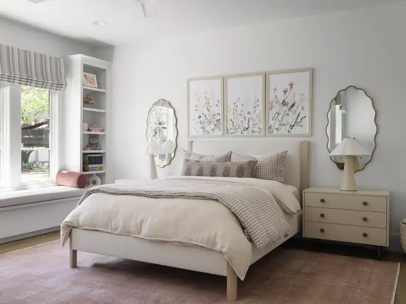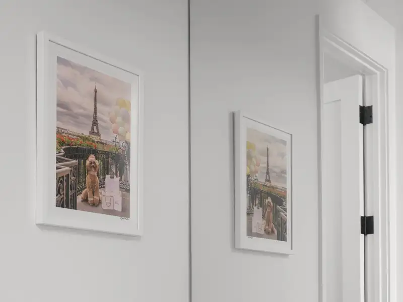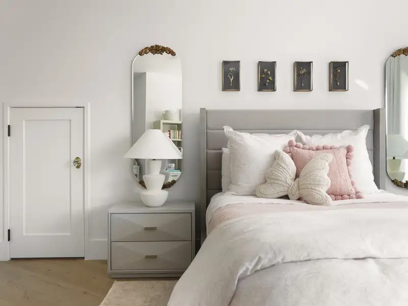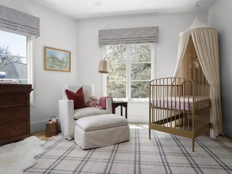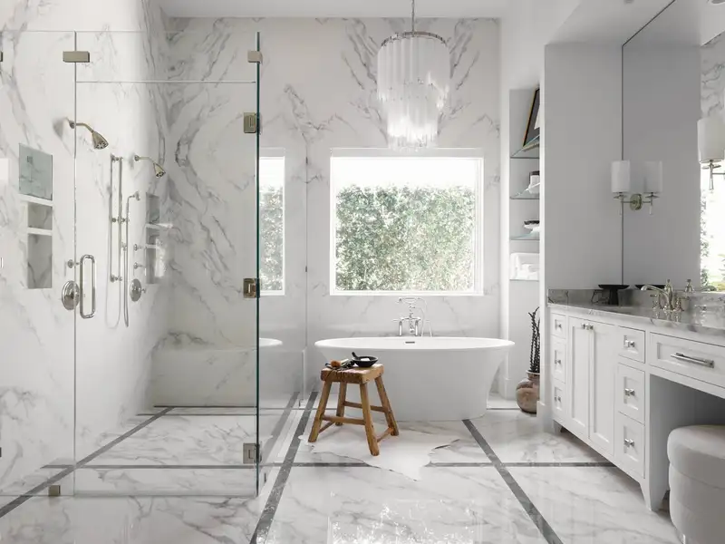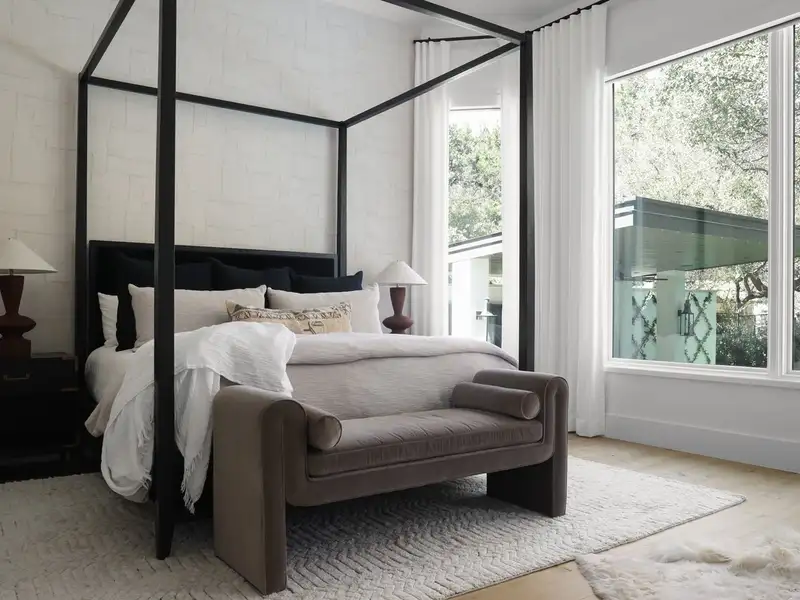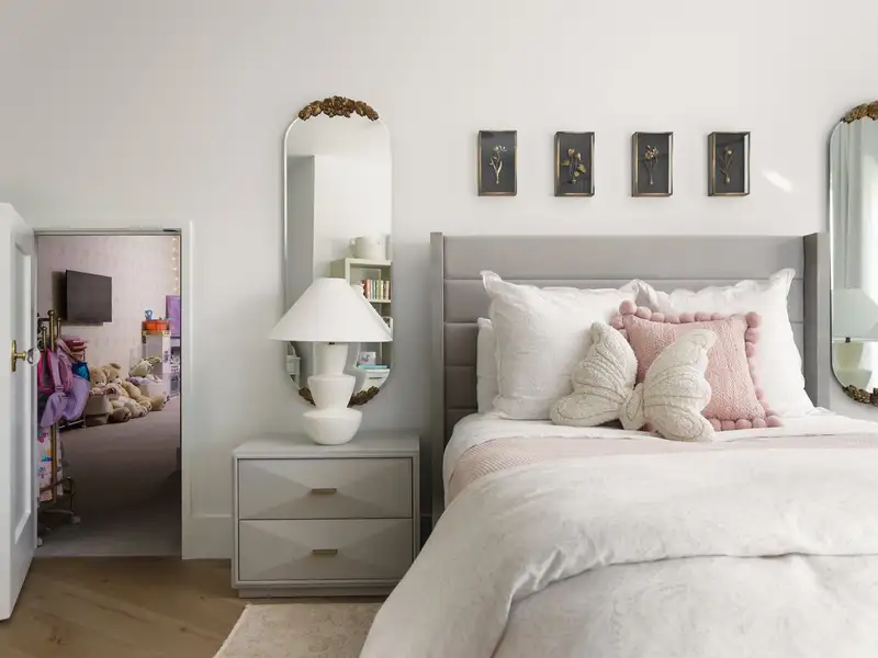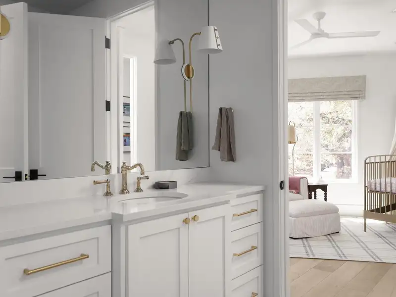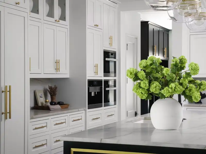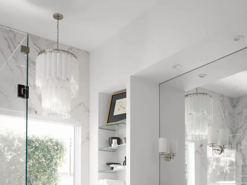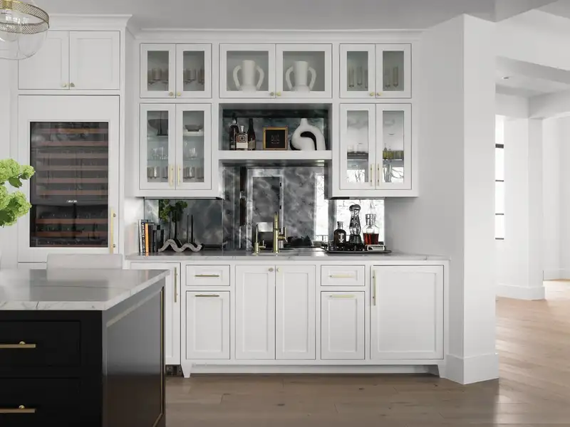 Inside, every detail speaks to a heightened level of design. White oak floors, lueders stone, and tiles from Ann Sacks and Horizon Italian Tile form the foundation of a serene and stylish palette. Designer lighting fixtures complement handcrafted custom cabinetry and countertops curated from Architectural Tile & Stone. The kitchen is outfitted for a culinary connoisseur with Wolf, Sub-Zero, Miele, Cove, and Marvel appliances, while custom hardware and plumbing fixtures elevate the tactile elegance throughout. The living spaces, graced with bespoke millwork from Delta Millworks and striking custom railings, include multiple sitting areas, a formal dining room with adjacent butler’s pantry, a media room with wet bar, and a bright lounge that flows seamlessly through bi-fold doors onto the covered veranda, creating indoor/outdoor living.
