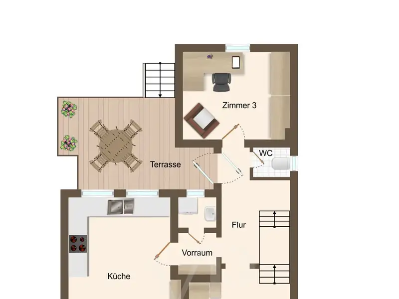 Another highlight of the villa is the spacious fitted kitchen, which impresses with modern appliances and ample storage space. It directly adjoins the terrace - a pleasant place for socializing in the open air. The well-kept garden offers many possibilities for use, whether for gardening enthusiasts, children playing or relaxing hours outdoors.