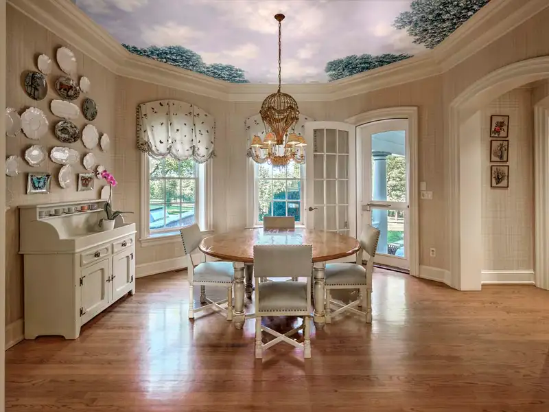 Classic design elements within the layout include seven intricately mantled fireplaces, oak wood floors, arched doorways, traditional moldings and woodwork, stunning architectural details, unique built-ins, custom-painted rooms, exposed ceiling beams, two wet bars, a rear staircase and covered porte-cochère access to the home's three-car garage. Hiland Hall Turner Architects oriented the residence on the acreage to take advantage of morning sunlight in the front rooms and colorful sunsets in rear-facing spaces.