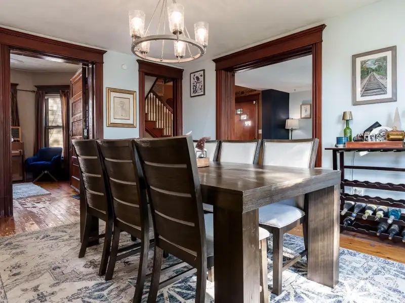 - Rustic hardwood floors in dining room