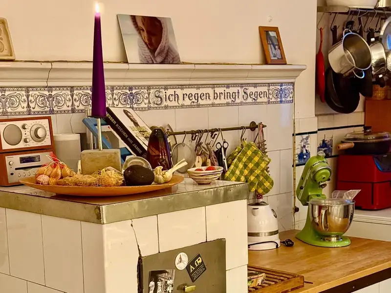The kitchen is a real eye-catcher, characterized by its historic kitchen fittings, including an original cooking machine, which preserves the charm of times gone by. At the same time, modern electrical appliances and practical work surfaces offer contemporary convenience.
