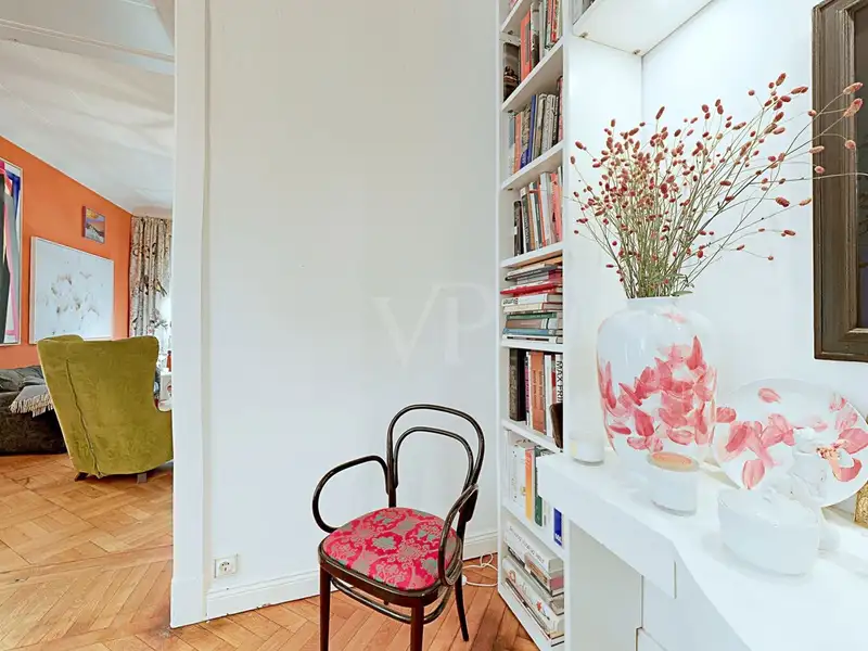Designer pieces specially made or stylishly selected for the apartment, e.g. two libraries by Paschen, an imposing Flemish crown by the Wurzen lighting manufacturer, glass lamps by Lasvit and others or curtains by the Scottish manufacturer Timorous Beasties lend the apartment its elegant and cosmopolitan flair and can also be purchased if required.