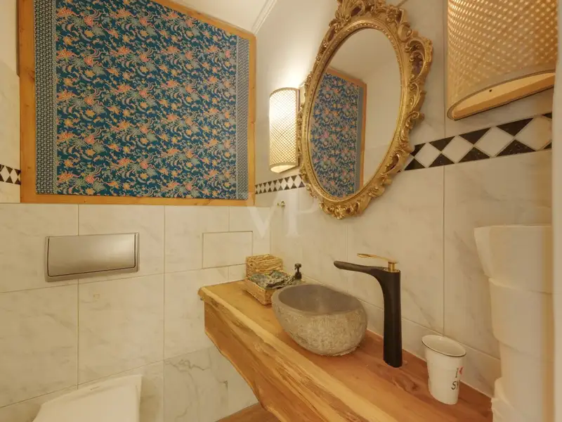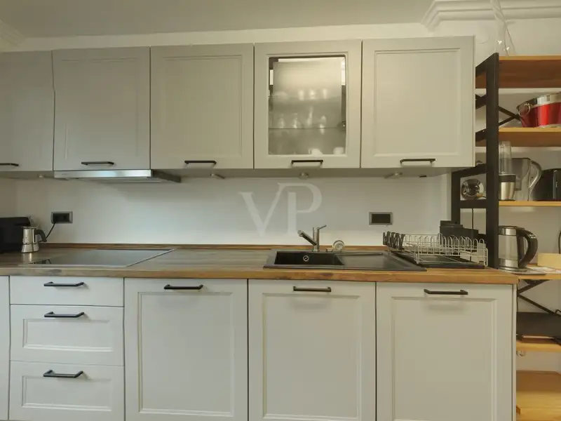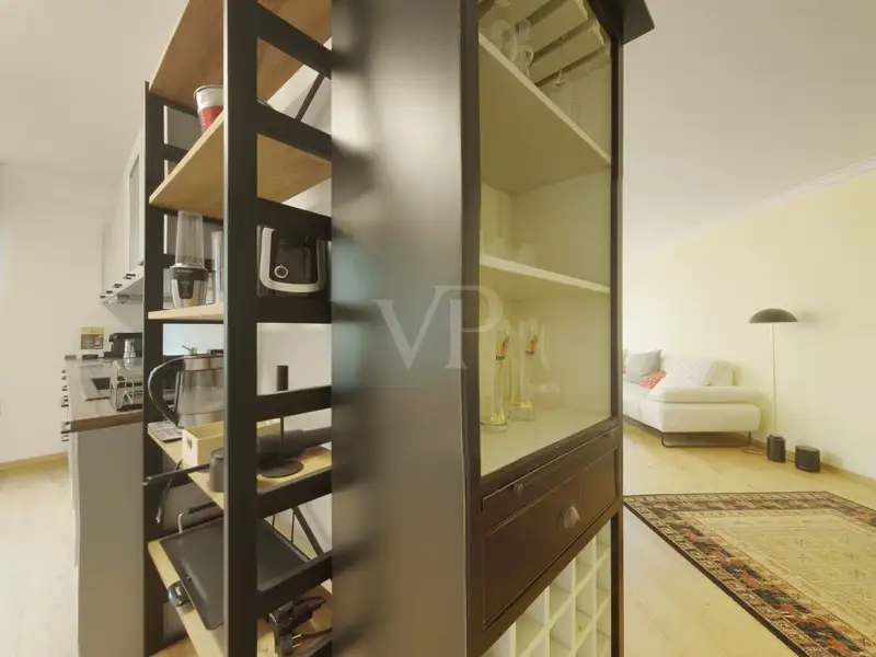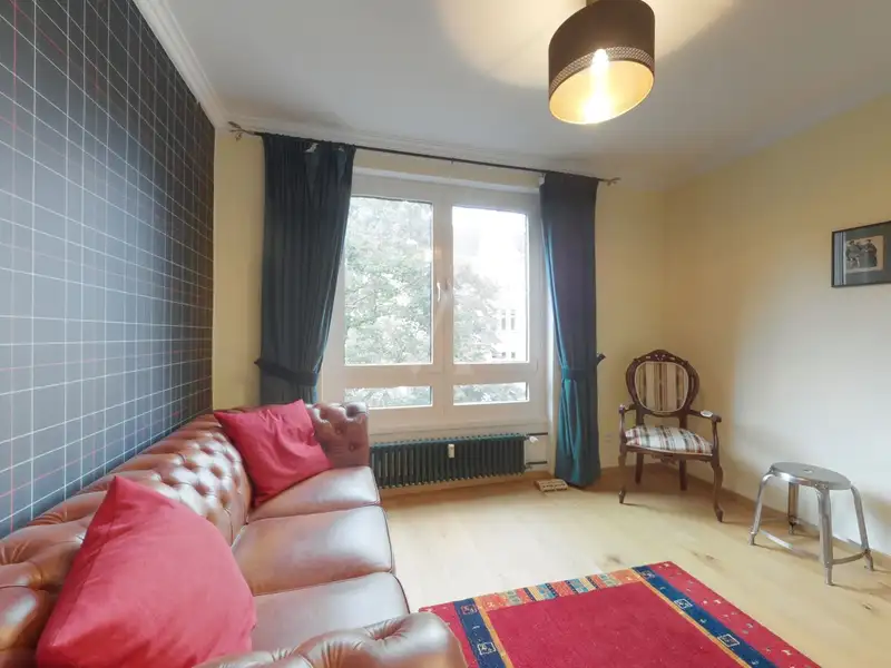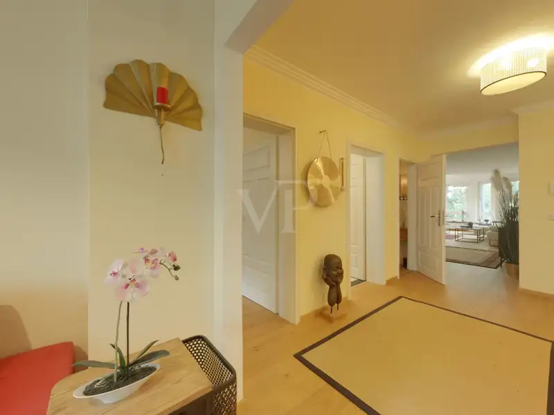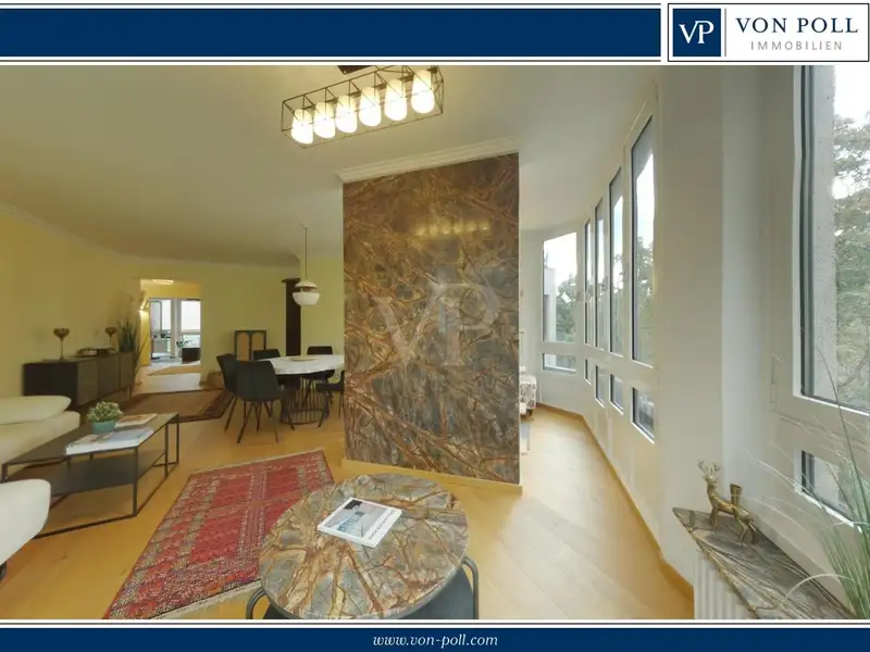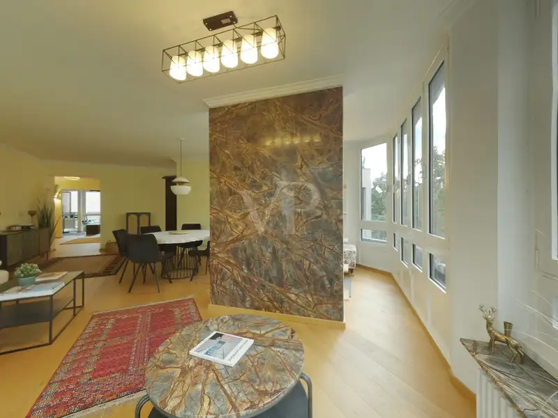 The apartment is located in a well-kept apartment building and can be easily reached via the elevator. Upon entering, you are greeted by an inviting entrance area, which makes a pleasant first impression and offers sufficient space for a checkroom. The generously proportioned living and dining area impresses with bright window fronts that provide plenty of natural light and create a friendly ambience. The highlight and eye-catcher in the living room is a free-standing marble wall. This was designed by the famous architect Mies Ludwig van der Rohe (1886 - 1969) for the World Exhibition in Barcelona in 1929.