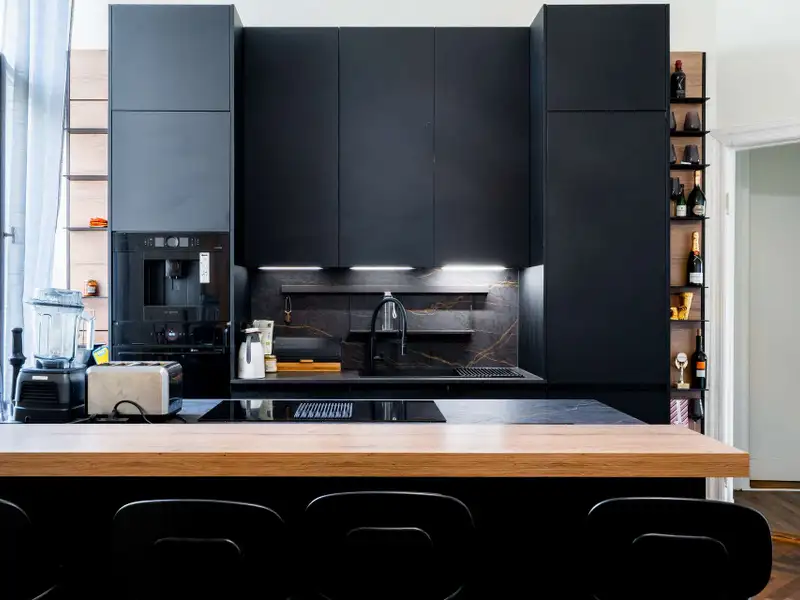 Der erste Eindruck überzeugt: Über das helle Entrée gelangt man direkt in den großzügigen Wohnbereich, der durch die Kombination aus offener Küche, Essplatz und angrenzendem Wohnzimmer eine besondere Großzügigkeit ausstrahlt. Die hochwertige schwarze Einbauküche mit Kochinsel bildet das Zentrum dieses Bereichs – stilvoll, funktional und ideal für gesellige Abende.