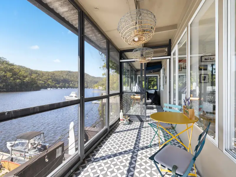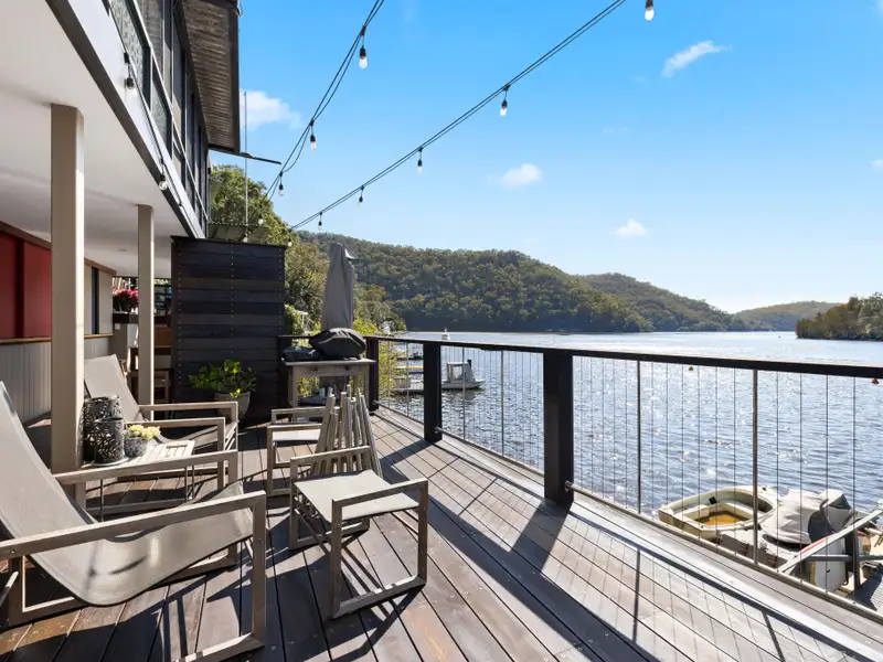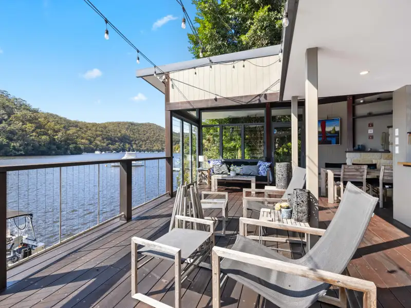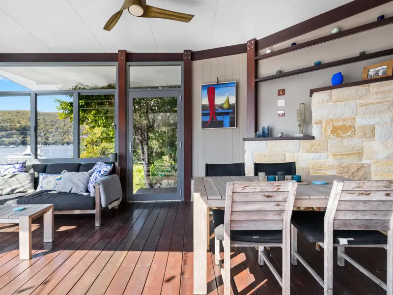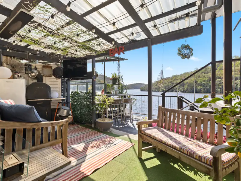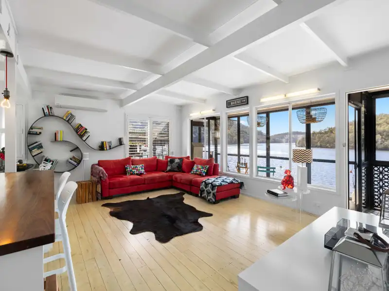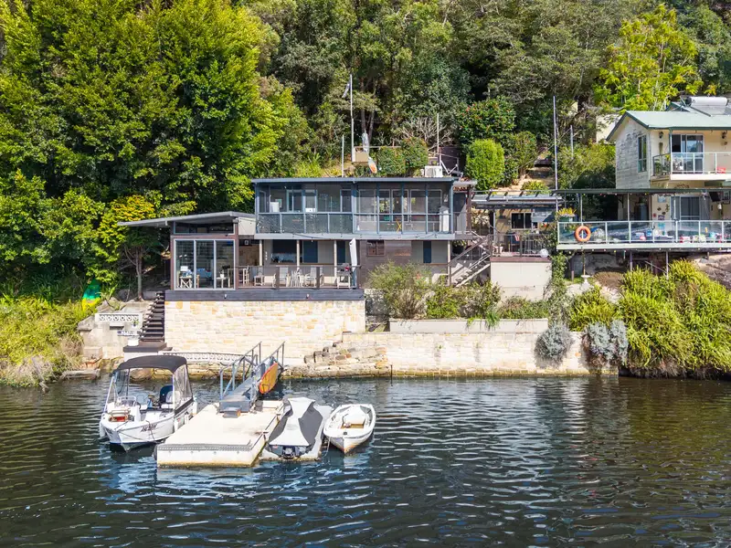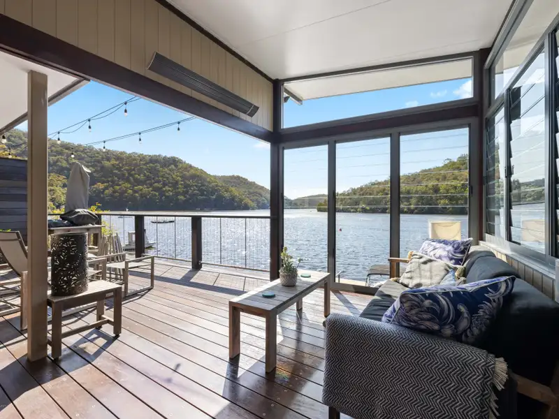 This water-access-only retreat, just 4 minutes by boat from Berowra Waters Marina, offers 2 bedrooms plus a guest room, perfect for family and friends. The open plan kitchen and living/dining area looks straight out over the water with a separate enclosed balcony area ideal for an office space or reading nook. The multiple indoor and outdoor spaces are designed for effortless entertaining and relaxed living taking advantage of the breathtaking water views and natural light. An excellent all-weather entertaining area invites you to host lunch by the water, while an elevated deck area at the back creates a great space for entertaining with stunning river views.