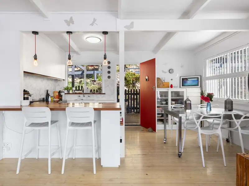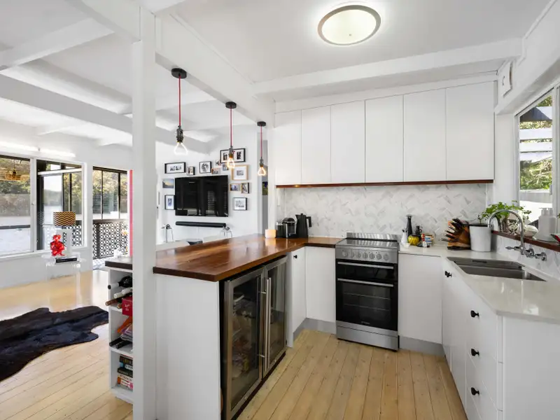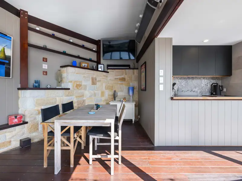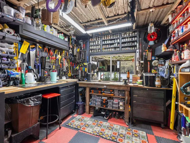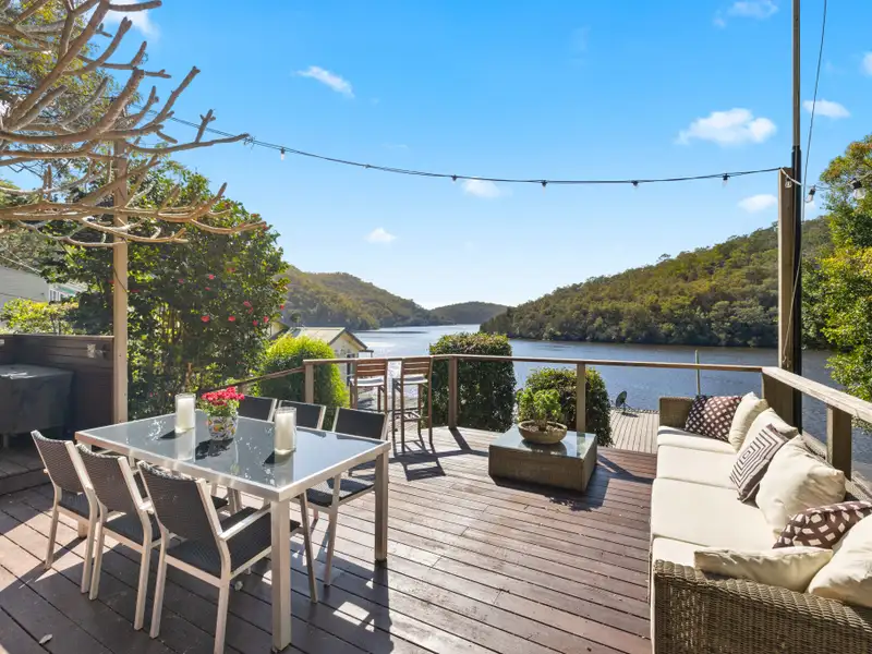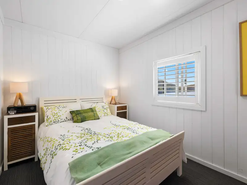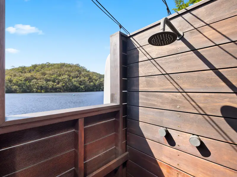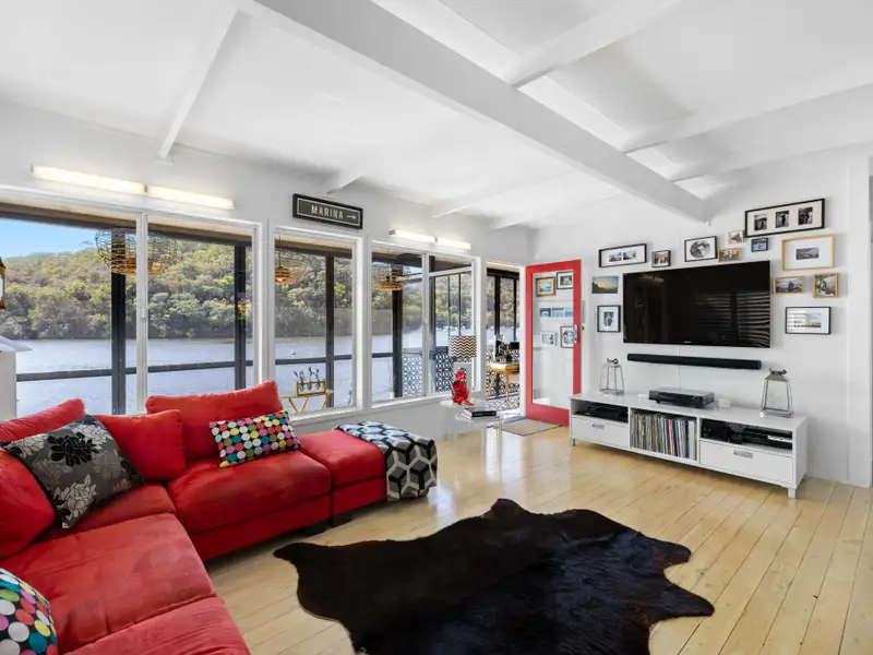 This water-access-only retreat, just 4 minutes by boat from Berowra Waters Marina, offers 2 bedrooms plus a guest room, perfect for family and friends. The open plan kitchen and living/dining area looks straight out over the water with a separate enclosed balcony area ideal for an office space or reading nook. The multiple indoor and outdoor spaces are designed for effortless entertaining and relaxed living taking advantage of the breathtaking water views and natural light. An excellent all-weather entertaining area invites you to host lunch by the water, while an elevated deck area at the back creates a great space for entertaining with stunning river views.