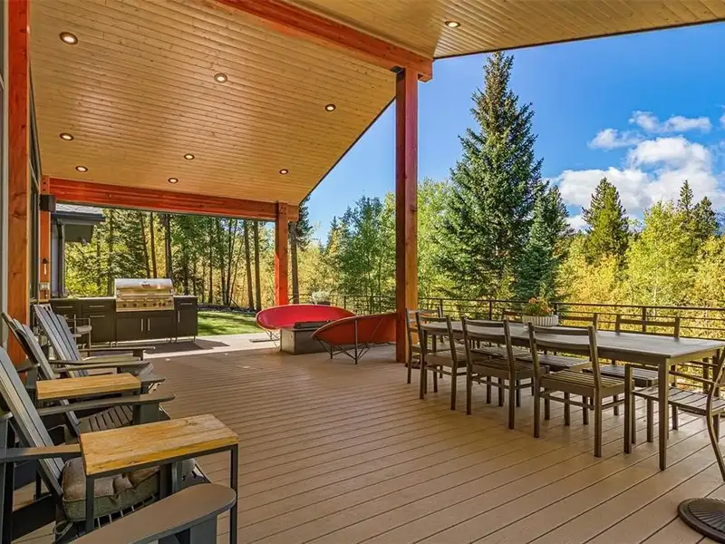 - West-facing covered deck with heated seating