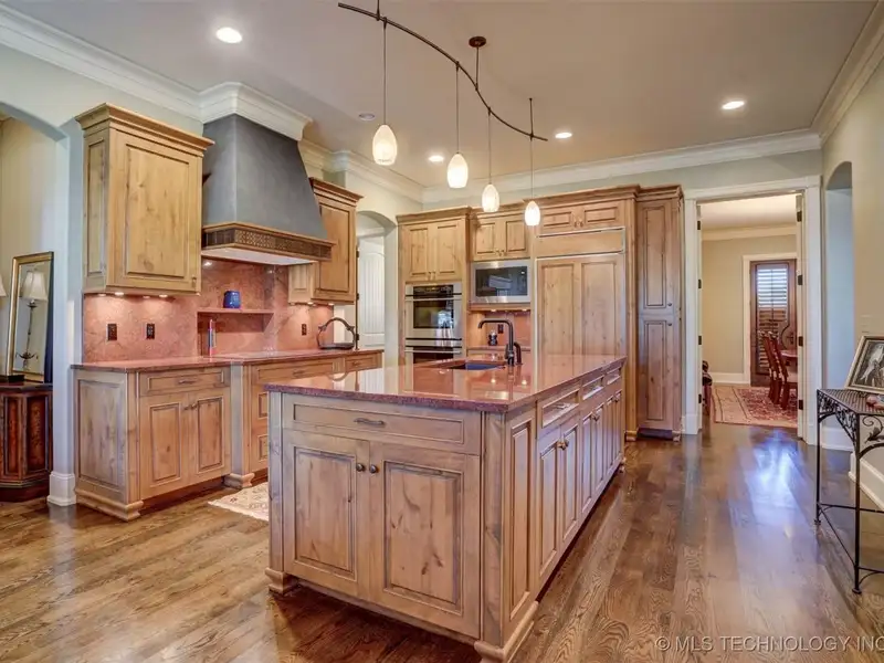 - Kitchen with double ovens and granite counters