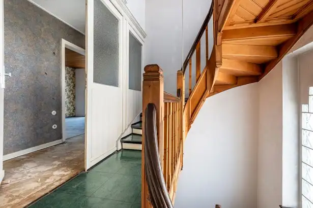 - Ornate wooden central staircase