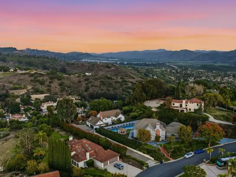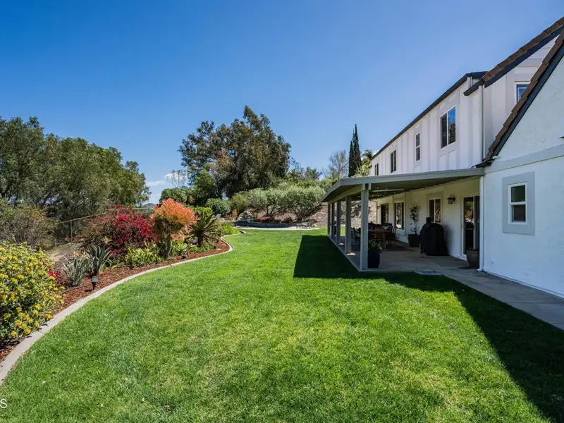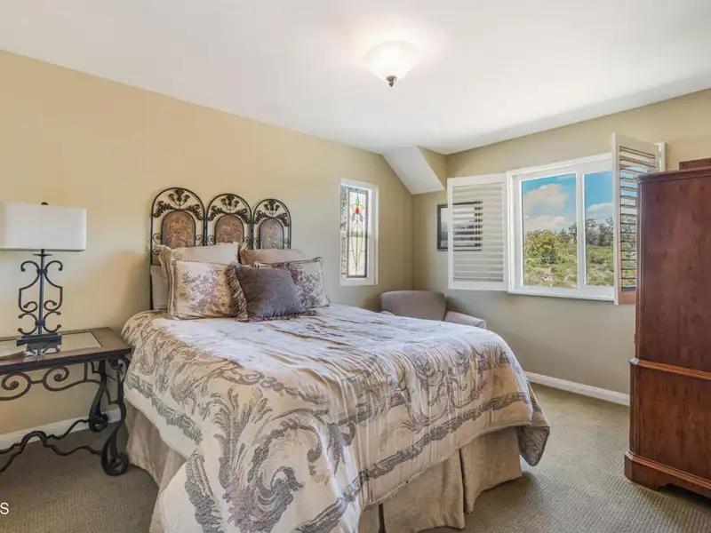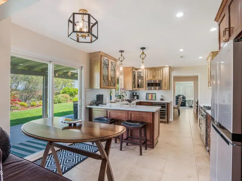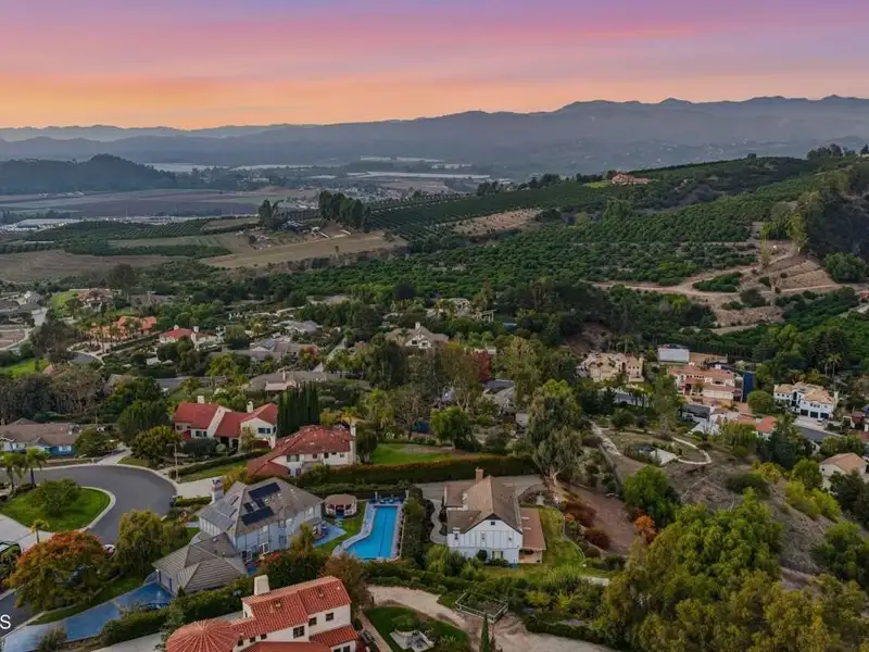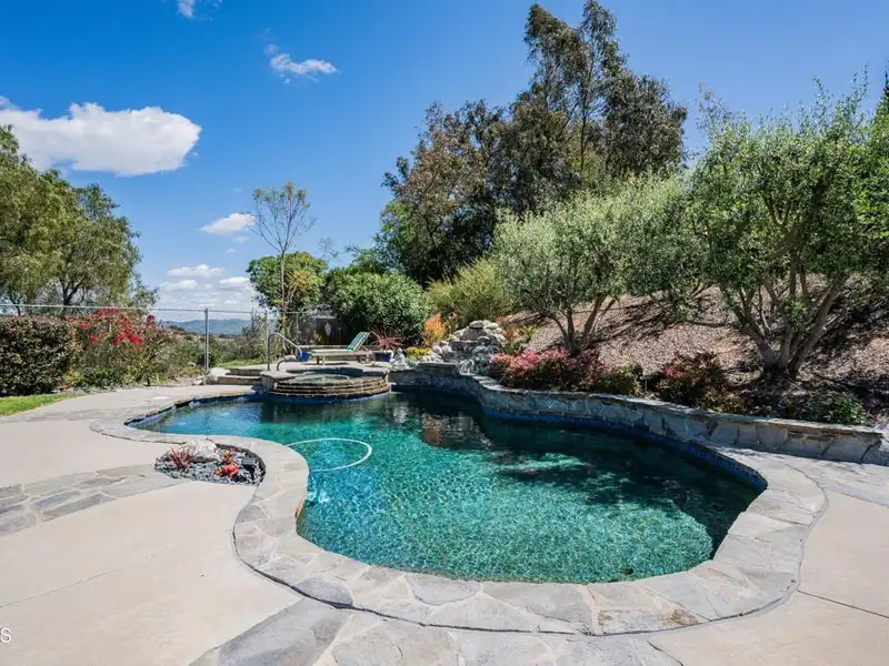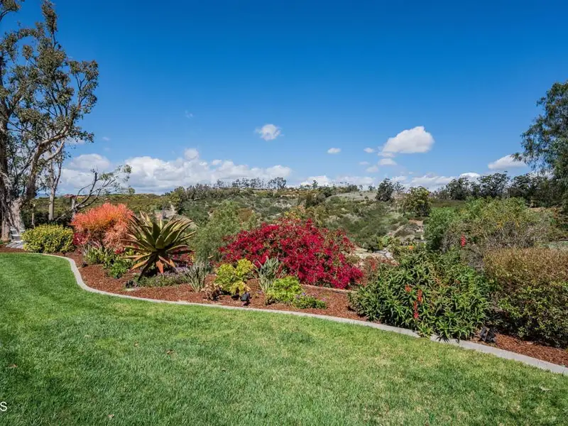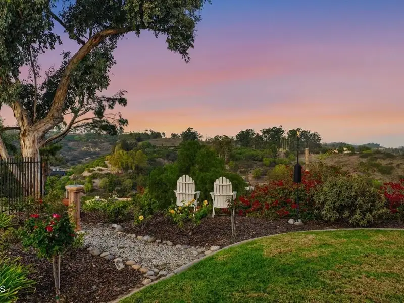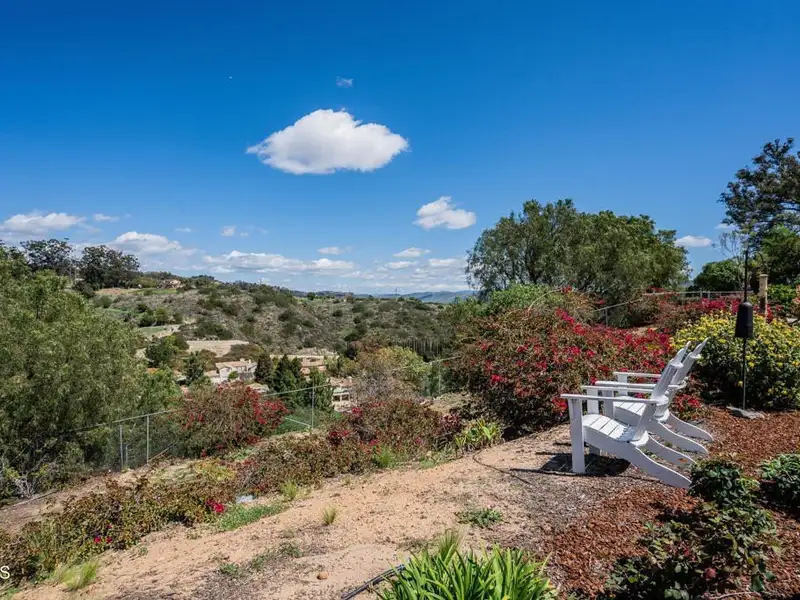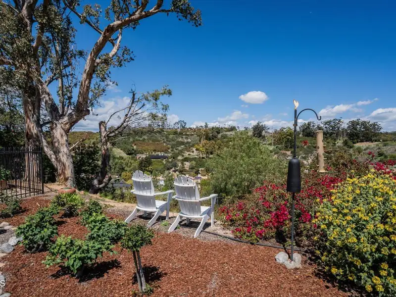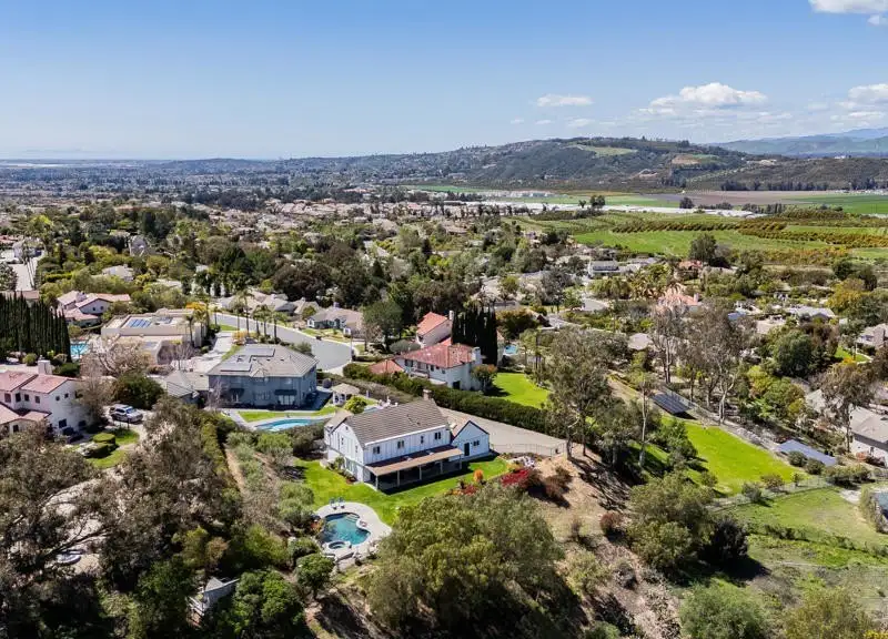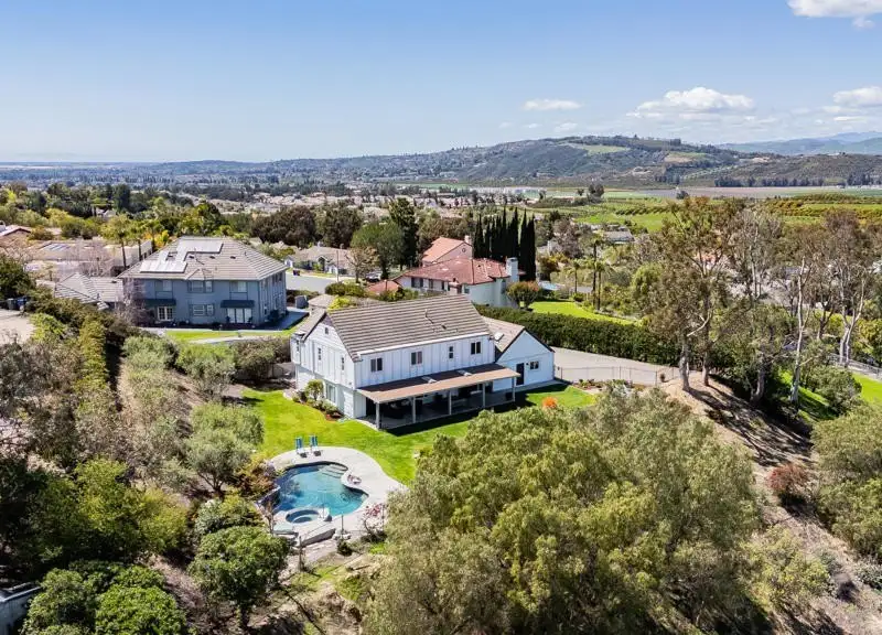 Experience modern luxury, privacy and sweeping VIEWS from this beautifully reimagined custom residence in the prestigious Terra Bella Estates. Set on a private flag lot and designed for both refined entertaining and everyday comfort, this home has been thoughtfully remodeled throughout with timeless finishes and an effortless indoor-outdoor lifestyle. Step inside to a warm, sophisticated living room anchored by a classic custom fireplace. Overhead, an exquisite Tiffany stained-glass chandelier adds a soft, artful glow - creating a space that is both elegant and inviting. The heart of the home is the beautiful chef's kitchen, where sleek quartz countertops, soft-close custom solid wood cabinetry with Rev-A-Shelf pull-outs, contrasting hand-cut lower cherrywood and upper hand painted wood complement high-end stainless-steel appliances including a commercial-grade 5-burner range and professional vent hood. A formal dining room sets the stage for memorable gatherings, while the adjoining family room offers a relaxed, comfortable space for daily living. With six bedrooms, including one conveniently located on the main level, the floor plan provides exceptional versatility. The primary suite is a calming retreat featuring a generous layout and a fully remodeled spa-inspired en-suite with quartz dual vanity, wash-let bidet, luxurious free-standing soaking tub, and an expansive walk-in shower highlighted with marble lattice tile and refined modern fixtures. The home also features a second full bath and two additional half baths, ensuring comfort and convenience for residents and guests alike. Step outdoors and discover your own private oasis! A covered patio invites lounging, dining, and quiet morning coffee moments, while the sparkling pool and spa - complete with a soothing waterfall feature - offer resort-style enjoyment with stunning panoramic views. Surrounded by mature olive trees and thoughtful landscaping, the backyard feels serene and completely private - an escape designed for true relaxation. The home has also been upgraded for modern efficiency and comfort, featuring a brand-new furnace, tankless water heater, and all new PEX plumbing. The two-car garage includes a versatile bonus room ideal for a home gym or studio, and an unfinished attic space offers exciting potential to be reimagined - possibly as an added room with an ocean view. A rare offering blending classic elegance, modern comfort and nature!