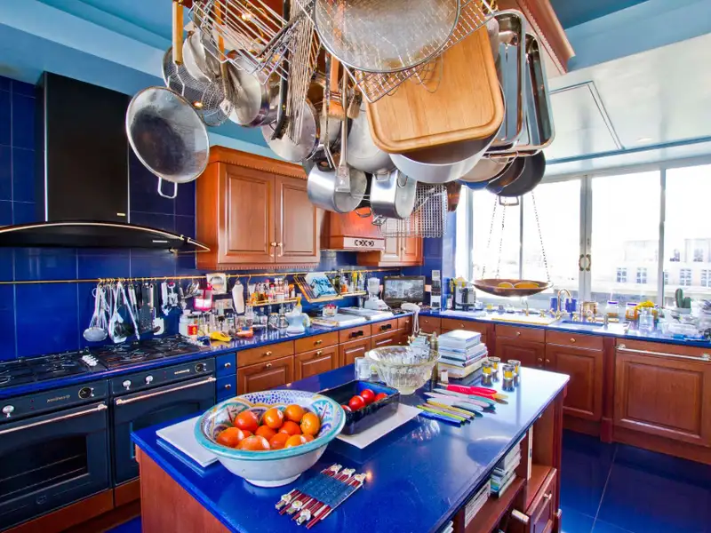 Gourmet entertainer's kitchen with panoramic views, two skylights, German-imported hanging pot rack, blue Italian marble tops and flooring, 10-burner gas stove, built-in grill and deep fryer, 3 refrigerators, wine cabinet, incinerator, dishwasher, and 2 industrial extract fans.