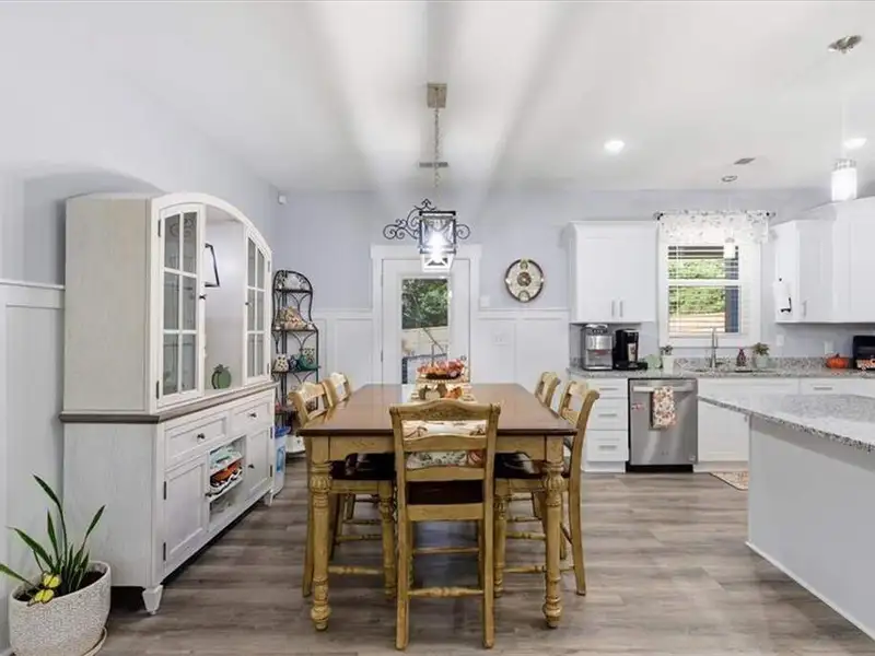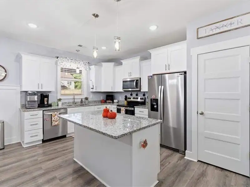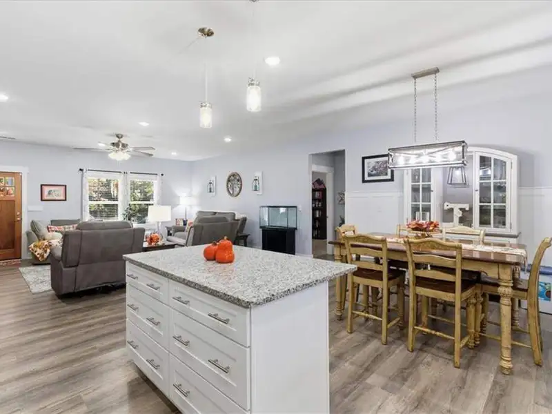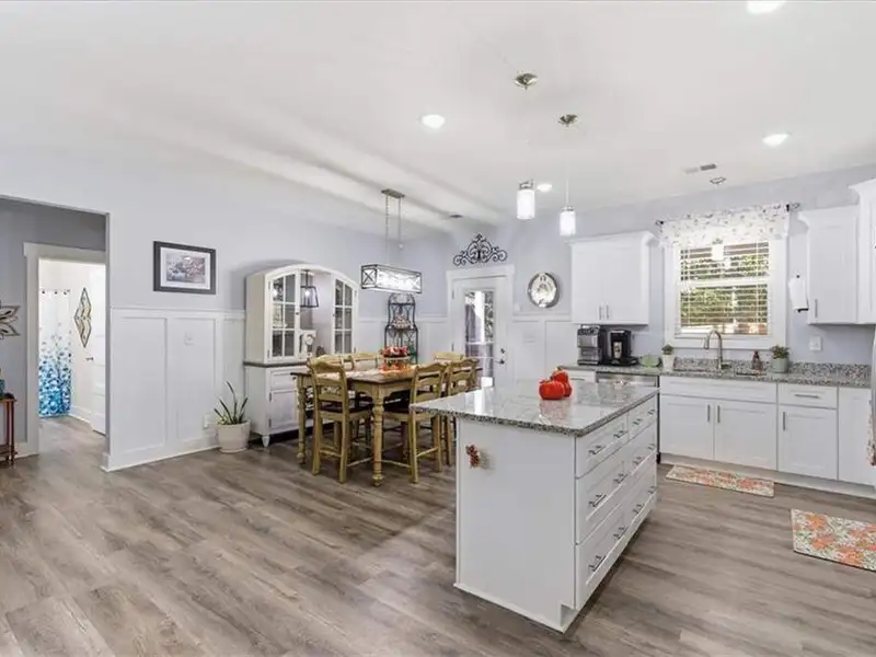 - Kitchen with granite countertops and large island