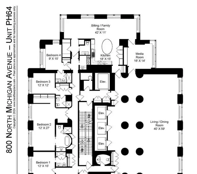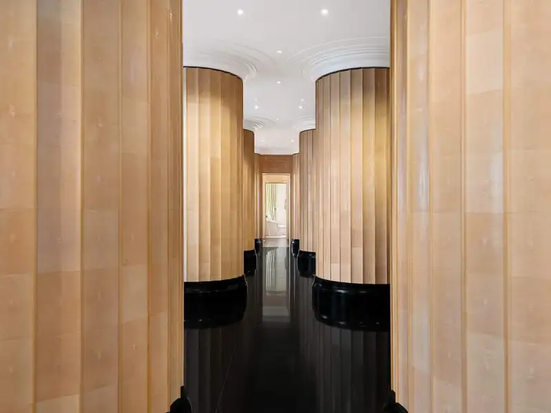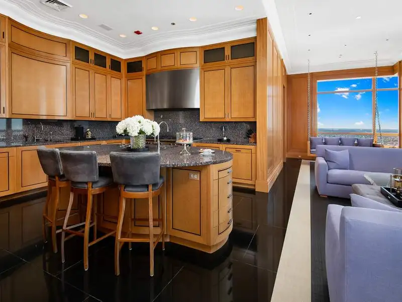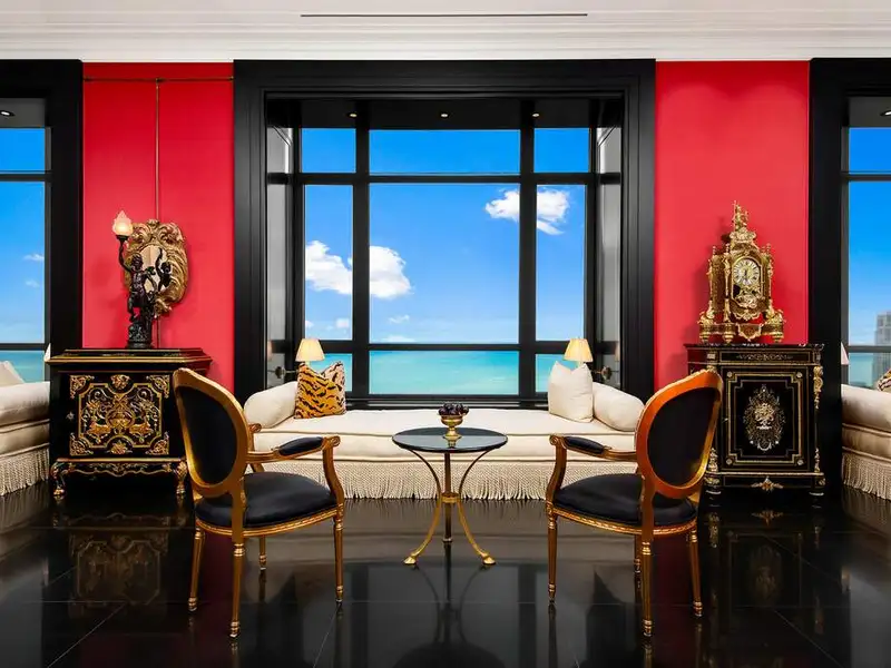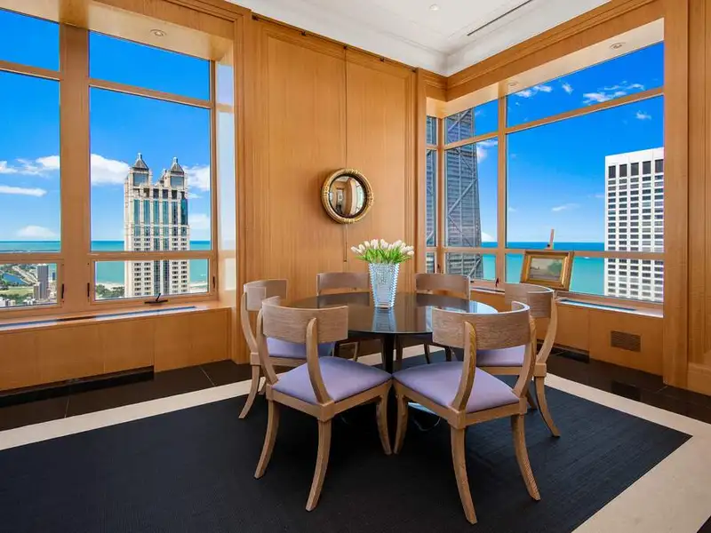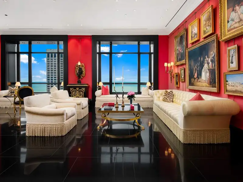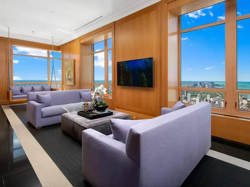An oasis above the clouds, this one-of-a-kind penthouse comprises the entire 64th floor at the prestigious Park Tower on North Michigan Avenue. Spanning 8,500 SQFT, this 15-room apartment was meticulously crafted by the renowned architectural firm Marvin Herman & Associates and Interior Designer, Mitchell Turnbough. With a 360-degree view of the city, this unique residence is designed to provide an unobstructed panorama of Chicago's skyline. Access this penthouse via one of three elevators and a private elevator foyer, secured with custom designed filigree metal doors and state-of-the-art controls. Herman and Turnbough created a bold sense of exhilaration and drama as you step into the home. The entrance introduces the apartment's 12' ceiling grandeur with an allee of elegant, fluted columns wrapped in cream shagreen. Each space within the home has been purposefully designed to create a sense of majesty without traditional barriers, offering a fluid, uninterrupted walk around the apartment. The living spaces are open and conducive to modern family living, featuring high-level, durable finishes, and bespoke anegre wood paneling. The custom plaster cornice and walls were crafted by hand. Inspired by a vivid Ferragamo scarf, Turnbough enveloped the 2,400 SQFT grand living room and dining room walls in salmon-pink velvet. The space is further enriched with polished black granite floors and lacquered baseboards. The choice of red hues throughout the room enhances the natural light, creating a dynamic interplay of colors that shift with the day's arc, adding a sense of luxury and softness. This ensures the space is equally suited for stately celebrations and intimate gatherings, maintaining a sense of warmth and inclusion regardless of the event size. The dream kitchen features sprawling granite counterspace, top-of-the-line appliances, and is clad in impressive quarter cut figured anegre custom cabinets and wall paneling. A butler's pantry, a unique ovular island, and abundant storage complete the space. The kitchen opens to a great room showcasing spectacular lake and city views with north, east, and west exposures. This gracious space accommodates a breakfast room, a large family room, and a playful 8-person "porch swing," at the west corner of the family room, which floats gracefully from the 12 ft ceilings. The corner primary suite occupies the entire south wing and enjoys abundant sun from southeast exposures and views of the lake and the city down Michigan Avenue. Clad in quarter cut figured English sycamore paneling, no expense was spared in the custom closet & dressing room where you will find copious hanging space, a three-way mirror and a center island. The closet also doubles as a panic room. A luxurious ensuite bathroom, accoutered entirely in a soft golden-green onyx with book matched creamy marbling and gilded gold fittings, enjoys southwest corner views & features heated floors, a steam shower & tub with west-facing views. A sizeable home office paneled in quarter cut figured English sycamore flanks one side of the primary suite while a large exercise room flanks the other side and leads to the west wing of the residence, which is dedicated entirely to four ensuite guest rooms. The owner paid special attention to structural integrity and sound insulation, ensuring a reposeful living environment amidst the bustling city. From an aesthetic perspective, even the door hardware was exclusively designed by Marvin Herman for this penthouse, creating a high level of customization. The home is equipped with automated shades, smart Control 4 integrated surround sound & TV system. This residence offers a rare opportunity to own a significant piece of Chicago's architectural innovation, where every detail has been crafted to ensure unparalleled elegance & comfort. Enjoy Renowned Park Hyatt Hotel amenities at your disposal - 24 hour fitness center, indoor pool, spa, in-room dining, and the acclaimed NoMi restaurant