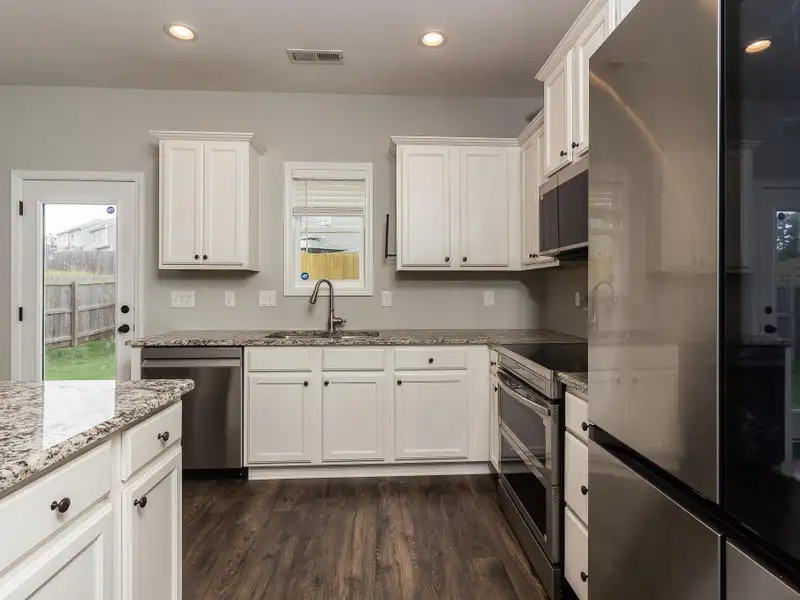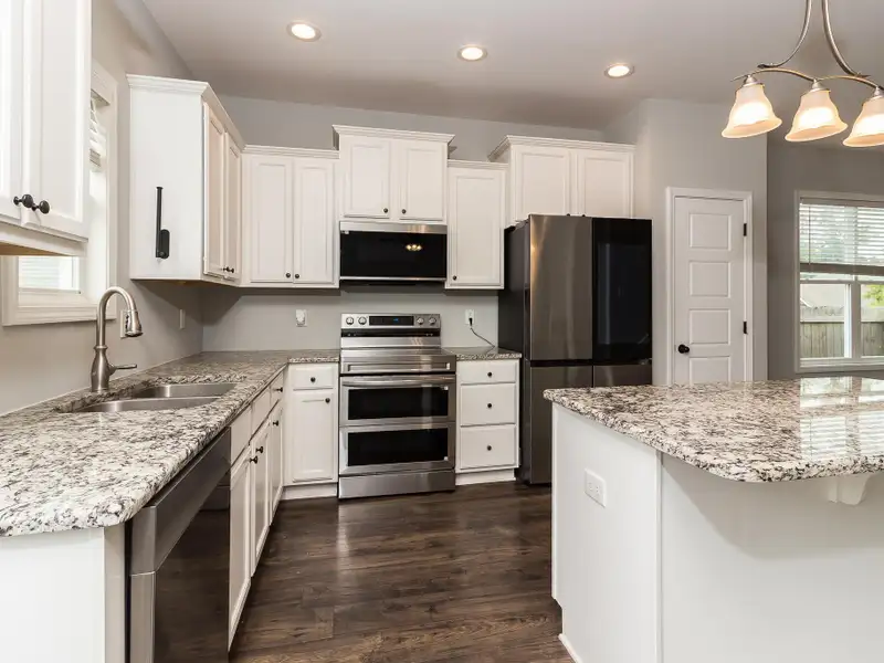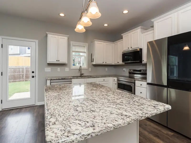 - Kitchen with granite countertops and island