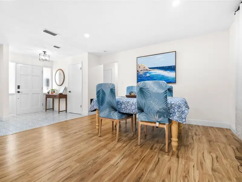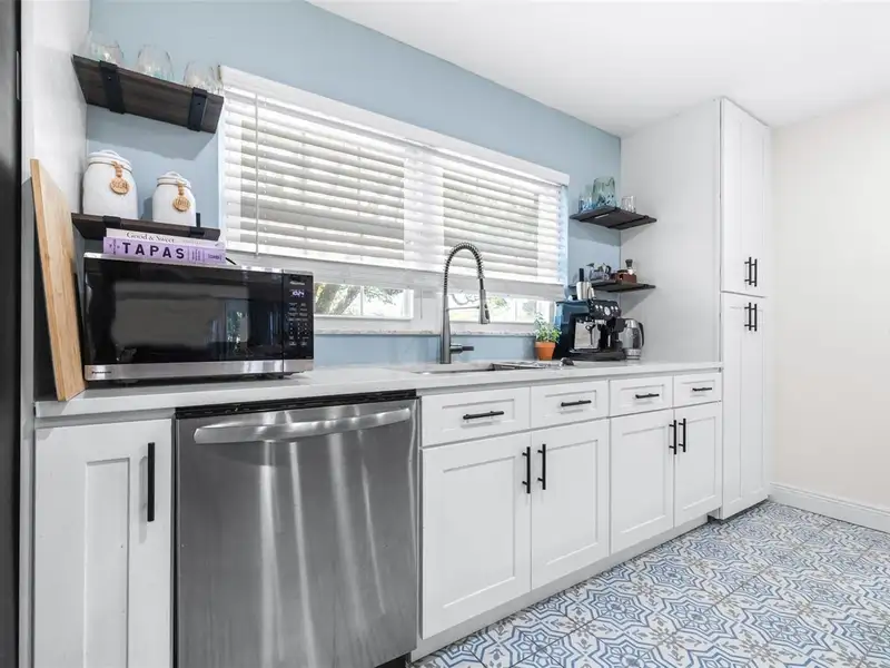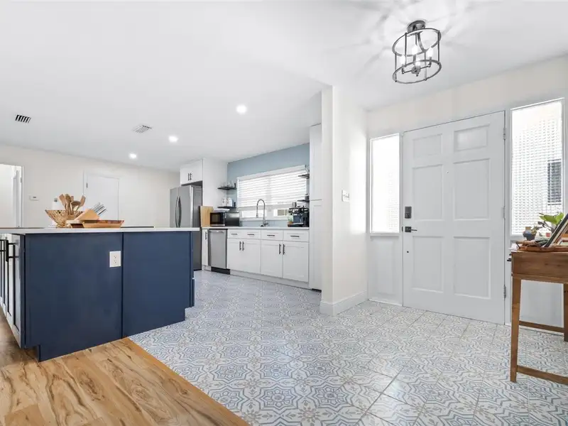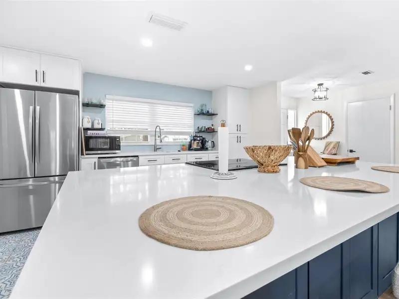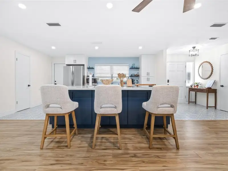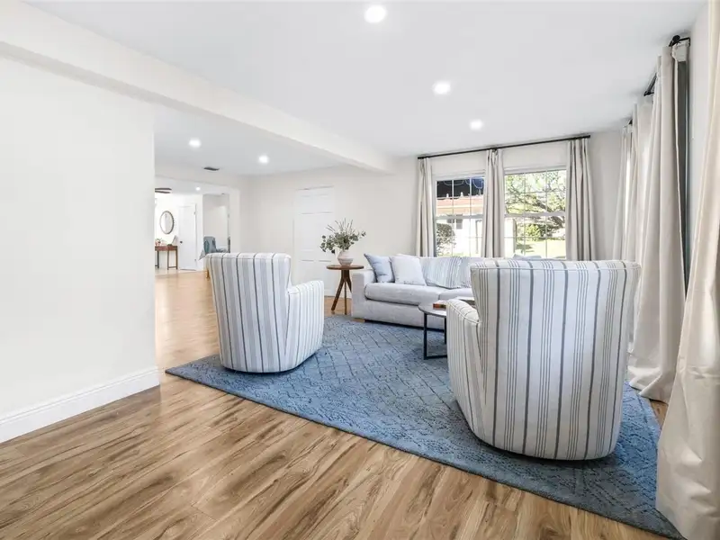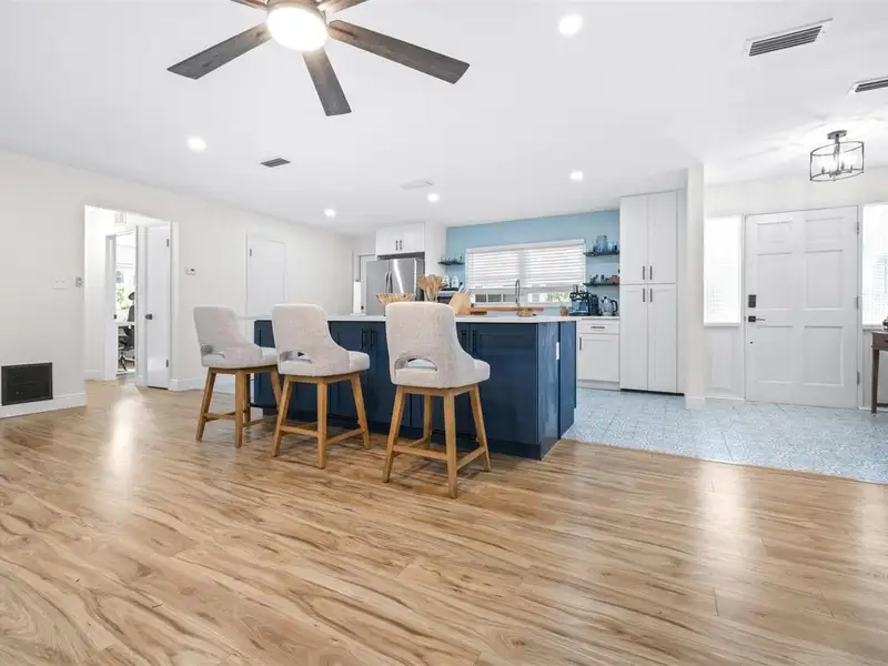 BRAND NEW ENERGY EFFICIENT AC JUST INSTALLED Welcoming Retreat in The Meadows at Morningside Discover your new sanctuary nestled beneath the graceful oak trees in this charming, well-established neighborhood. This beautifully renovated home is move-in ready, featuring a circular driveway that leads to an exquisite leaded glass front door. As you enter, you’re greeted by an inviting open floor plan that radiates warmth and brightness. The heart of the home is an impressive oversized custom island, perfect for casual dining or hosting gatherings, showcasing premium quartz countertops and stylish blue cabinetry that pairs beautifully with the white shaker-style cabinets, complete with soft-close drawers and open shelving. The elegant designer tile flooring enhances the space while providing ample storage through two large pantries.The kitchen seamlessly connects to generous living and dining areas, creating an ideal environment for entertaining. Retreat to the primary suite, which boasts a spacious walk-in closet with an organized storage system and a chic barn door accent. The en suite bathroom is a luxurious escape, featuring a stunning double vanity with quartz counters and modern gold fixtures. The newly tiled shower, adorned with designer details, reaches up to the ceiling for a truly impressive look.Adjacent to the primary suite, the second bedroom is versatile enough to serve as a nursery, home office, or guest room. On the opposite side of the home, you’ll find two additional bedrooms and another beautifully updated bathroom with a stylish vanity and shower-tub combination. The expansive living area offers limitless potential for your lifestyle needs.New windows provide views of the spacious, pool-sized backyard, where a magnificent oak tree stands as a centerpiece. This home is packed with upgrades, including a new insulated garage door with an opener, fresh interior and exterior paint, a modern keyless entry system, Mohawk luxury vinyl flooring throughout, and new recessed lighting and ceiling fans.Located just a short stroll from the newly renovated Morningside Recreation Complex, you’ll enjoy access to swimming pools, playgrounds, pickleball courts, outdoor basketball facilities, a gym, lighted tennis courts, and picnic areas. Plus, you’re only minutes away from the stunning Clearwater Beach, Honeymoon Island, the Pinellas Trail, Tampa International Airport, and the vibrant downtown areas of Dunedin and Clearwater. Seize this opportunity to make this delightful home your own!
