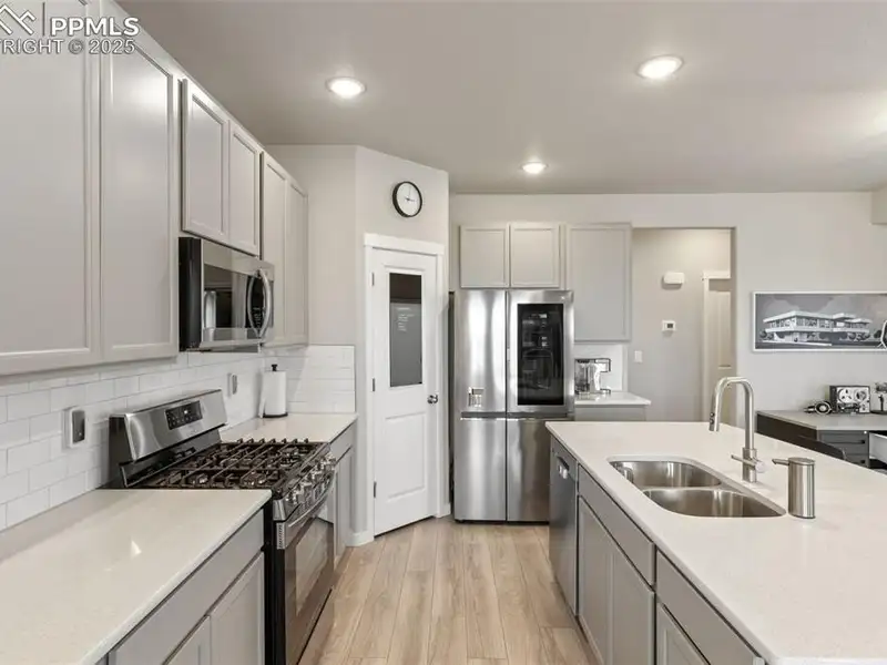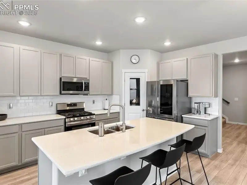 - Kitchen with quartz countertops and gas range