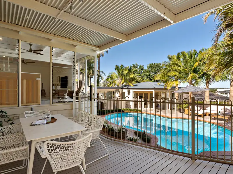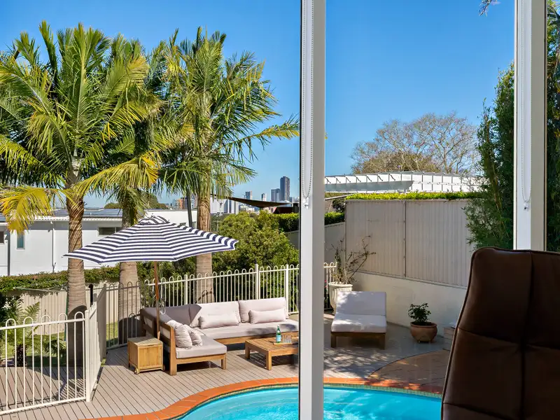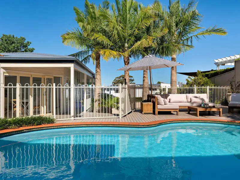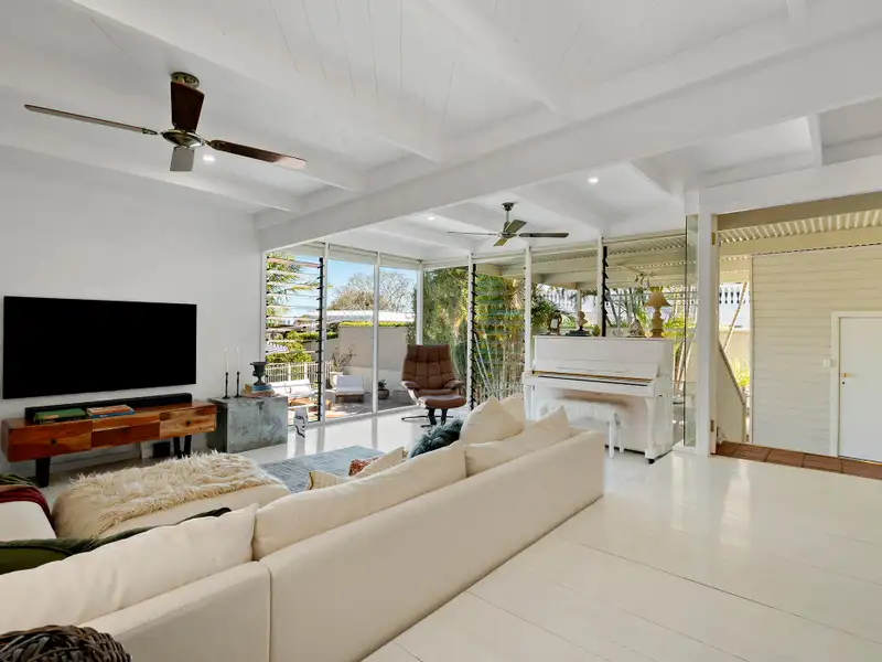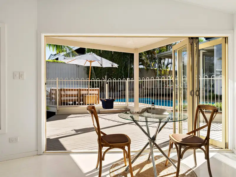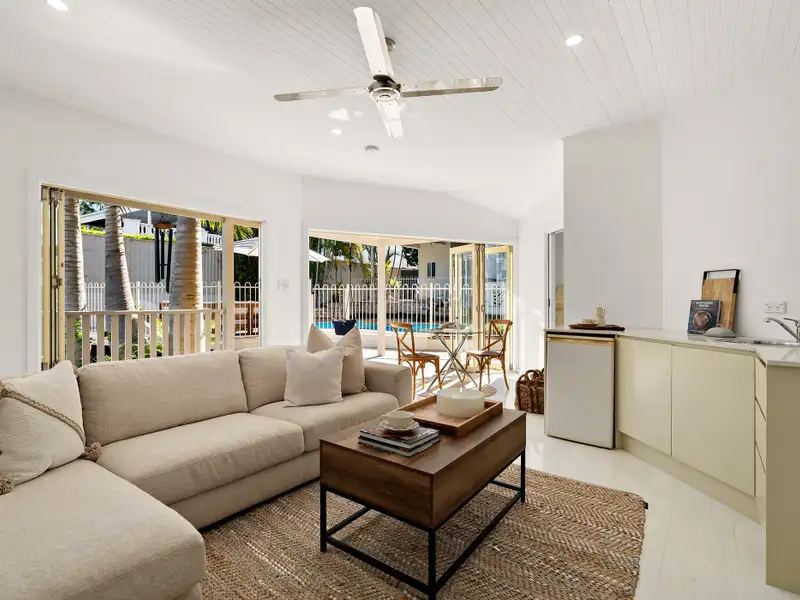 - Light-filled living with pool views