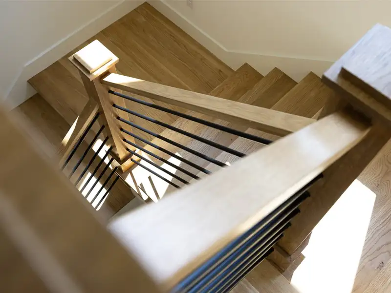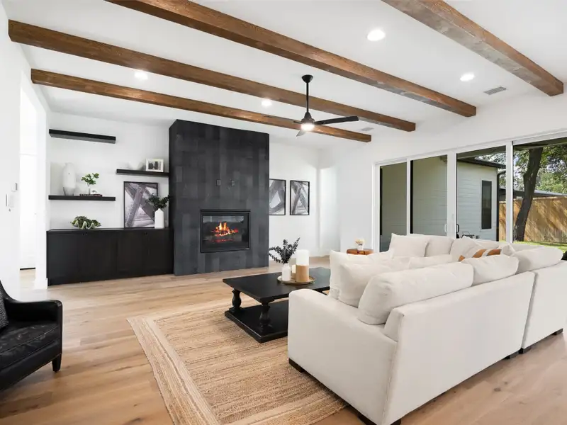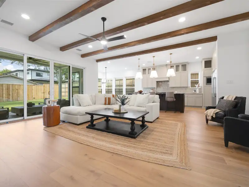 - Vaulted ceilings with exposed wood beams
