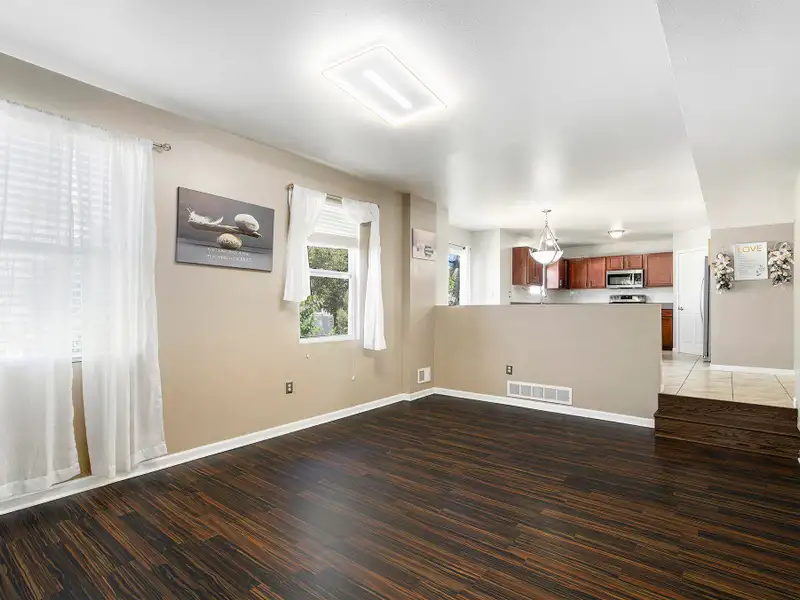 - Open floor plan with kitchen island