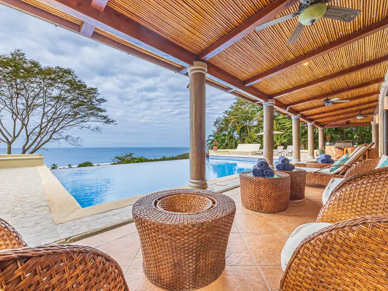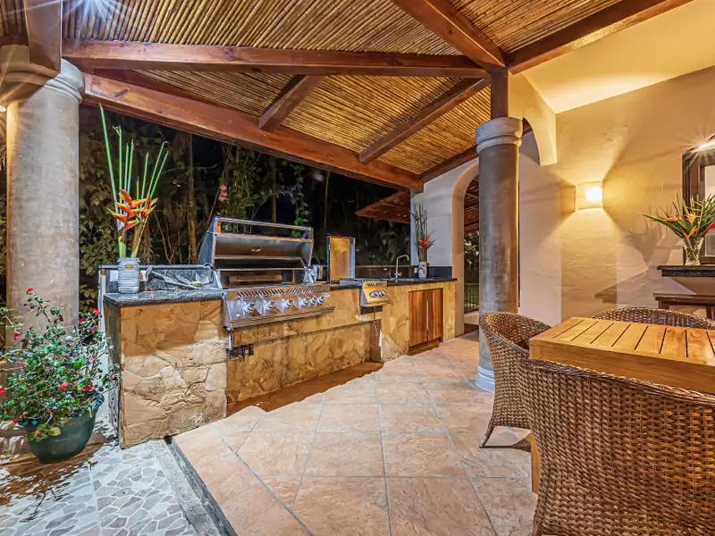 Venture outdoors to indulge in resort-style living: lounge on the massive infinity pool’s sun-kissed recliners, dine al fresco at the teak table, or cook in the outdoor kitchen with a built-in BBQ, sink, and burner. The covered patio creates a perfect retreat for relaxing while enjoying the gentle surf sounds and panoramic vistas. Surrounding the villa are lush gardens, ample outdoor furniture, and a private yard—an idyllic setting for weddings, yoga retreats, or exclusive getaways.