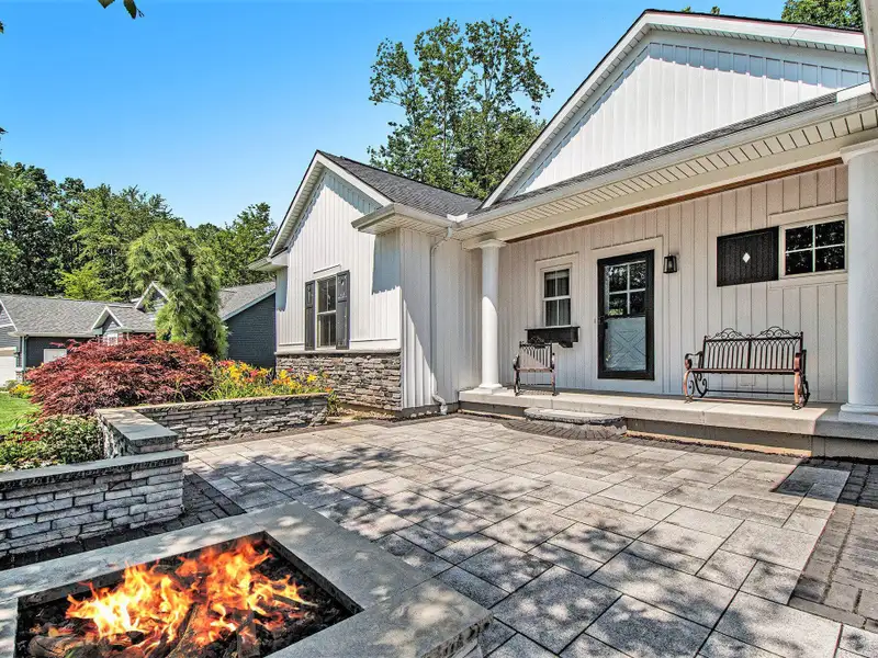 - Large stone patio with gas fire pit